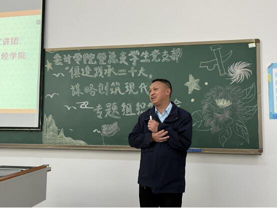 俱进践承二十大,谋略创筑现代化。会计学院党总支学生党支部借助巴南区“百姓名嘴”宣讲的契机召开了专题组织生活会。会上,巴南区“百姓名嘴”宣讲团团长、巴南区戏剧曲艺家协会主席胡必凡以“立德树人,人才教育”为主题向党员同志们宣讲党的二十大精神。会计学院党总支书记姚转花、学生一支部书记阳圆、二支部书记李萍、一支部组织委员刘丹丹、二支部组织委员杨秋菊及全体学生党员参与此次会议。胡团长激励学子们不要妄自菲薄、自暴自弃,不论在何处学习,都要刻苦钻研,力求成为某个领域的专家,坚定理想信念跟党走。