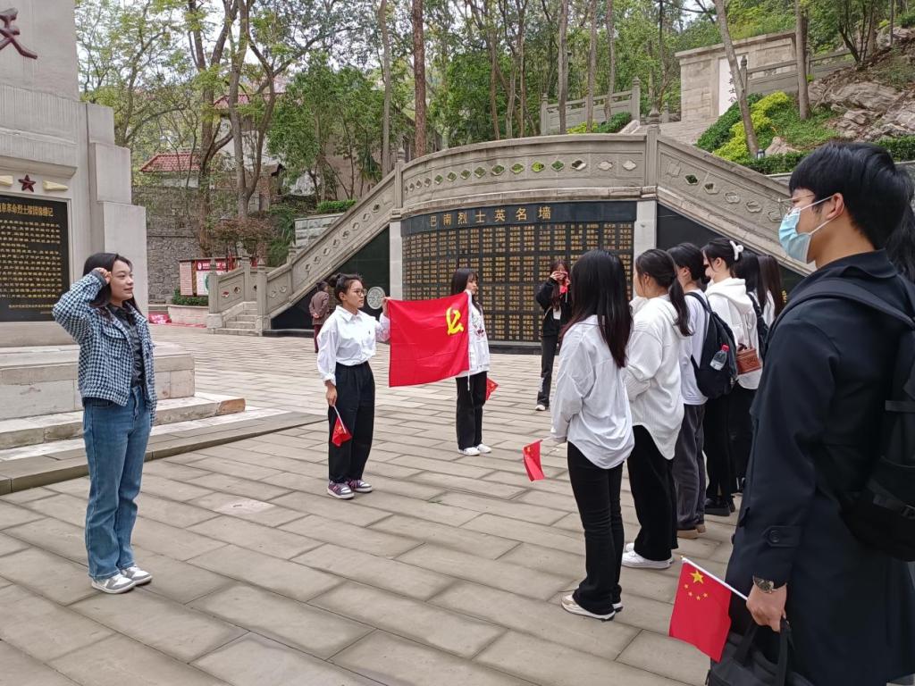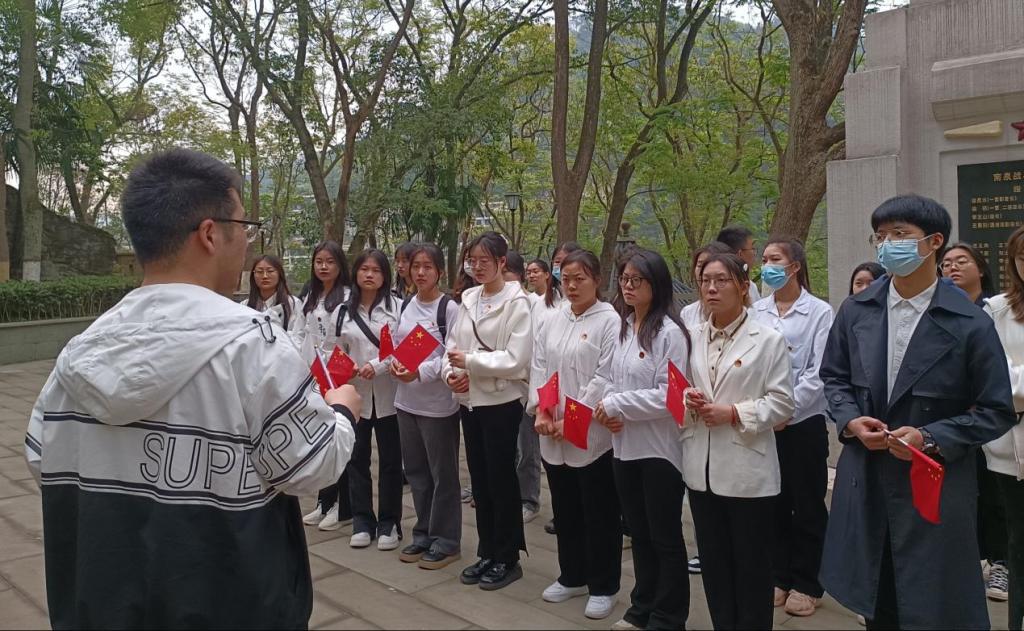 4月2日上午8点,同学们从学校西大门口集合后统一出发前往巴南区南泉烈士陵园,在陵园入口整齐列队进入陵园。活动开始,党支部宣传委员王俊尧带领全体党员在烈士陵园纪念碑前重温入党誓词。