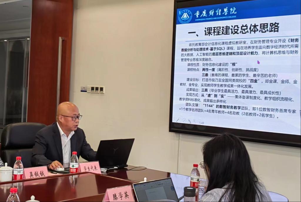 会议第一阶段,贺高祥院长介绍《财务数据分析与处理技术-基于SQL》课程筹备、课程实施过程、课程建设目标、课程保障等情况,并指出该课程是财务信息化建设的“根”,是通过集体备课制度化、教学组织流程化、教学资料标准化、成果输出多样化实现虚拟教研室化虚为实的重要典范。随后,教师代表韩冬梅分享了建设该课程的感悟,重点介绍了课程建设前的内心忐忑、建设过程中系统保障与充分准备、最后的收获等。学生代表展示了财务计算器、超市收银系统等作品,分享了账户登录、作弊软件等开发设计的思路。
