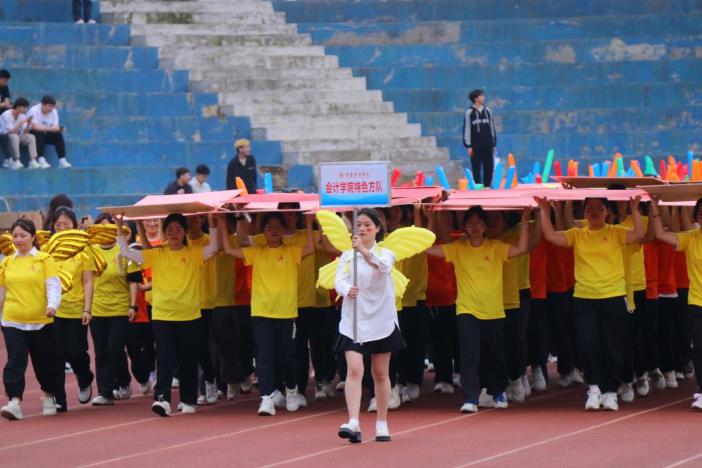 “奔跑新时代,奋进新征程。”这是对重财人殷切的期望,也是青年肩负重任的使命担当,全校师生翘首以盼,蓄势待发。党员方阵、裁判员方阵、学院方阵、专业方阵、教师方阵依次进场,师生们以饱满的热情,呈现出青春的活力,展示出团队的风采,体现了健康向上的运动精神。通过主席台时,他们以极具学院风格和专业特色的节目来展示自己的形象,传递对学校的热爱。
