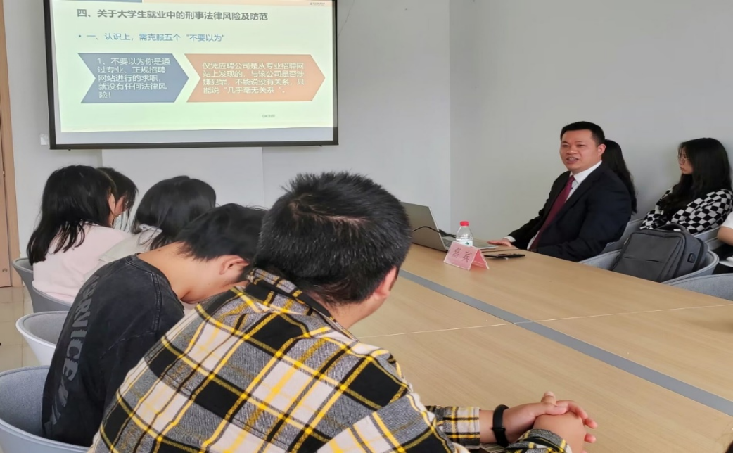4月27日上午,学院特邀重庆百君律师事务所李光荣律师进行“大学生就业法律风险及防范”主题宣讲。李老师从 “在校大学生兼职中的劳动关系判断”、“毕业生入职的十二大法律风险”、“创业的法律风险及防范”和“大学生就业中的刑事法律风险及防范”这四个方面展开讲解,提高了同学们的法律意识和防诈能力,为将来就业规避法律风险打下良好基础。