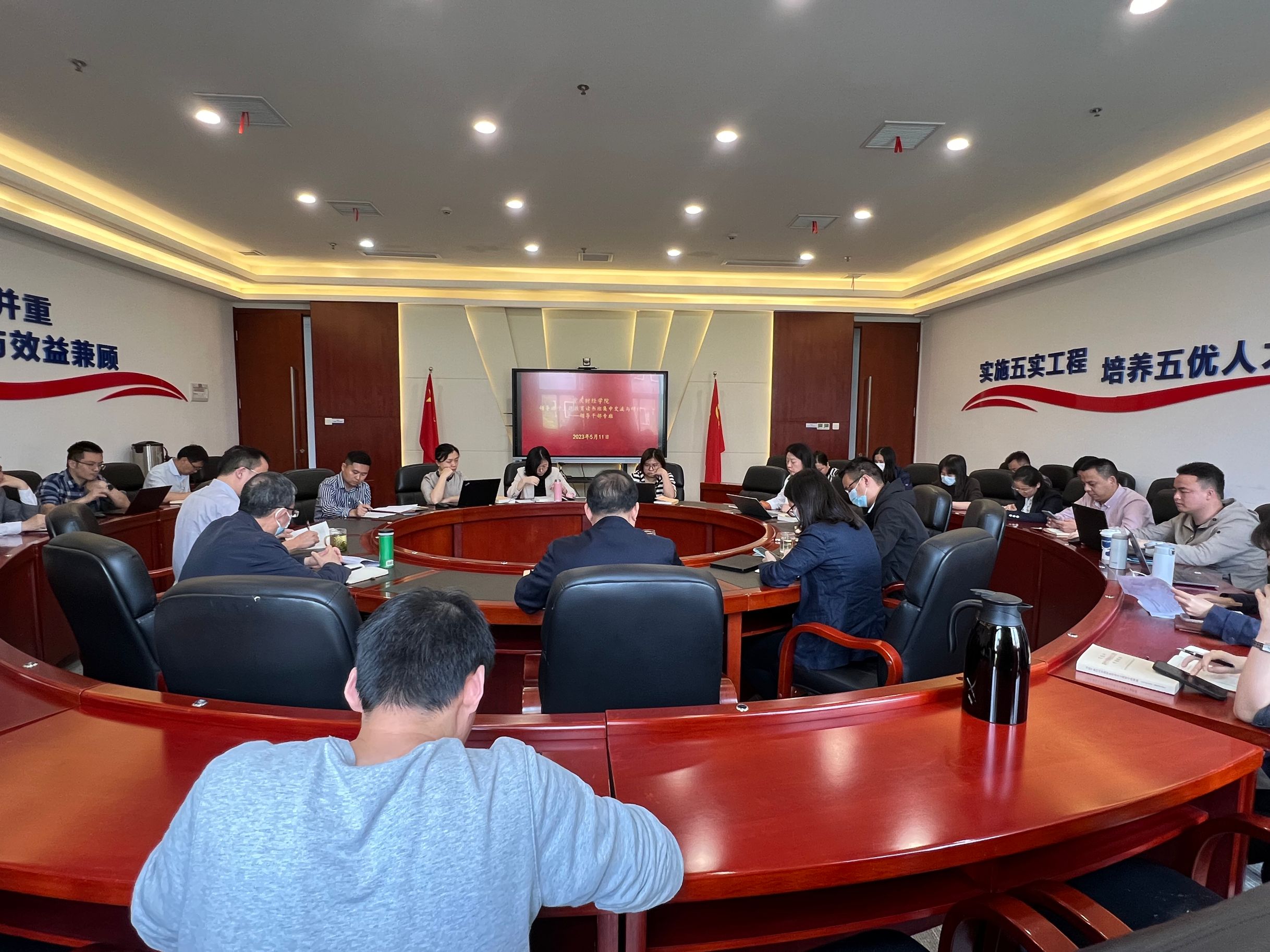 5月11日下午,在2302会议室,学校校领导、党委委员、纪委委员开展“全面促进高校高质量发展和法治建设”等主题的交流与研讨会,各二级学院党政负责人、职能部门负责人列席参加。会议由房朝君主持。会上,党委委员、宣传部部长倪倩茜,纪委委员、党政办公室主任宋湘琴,纪委委员、学生工作部唐川川,纪委委员、党群工作部李刚,纪委委员、会计学院党总支姚转花分别作主题发言。他们结合习近平新时代中国特色社会主义思想主题教育思想内涵和学校发展实际,对深化意识形态工作、提升办公服务水平、推进思想政治教育、强化党建引领等进行交流汇报。党委书记张毅作总结讲话,他指出要丰富主题教育学习的内容与方式,在集中研讨与交流基础上,可以通过邀请专家进校开展辅导报告,与专家面对面交流等,提高思想认识、强化思想共识,优化教育理念、提升教育水平,并对标教育工作与学生管理,切实推进学校教育改革发展更上一台阶。