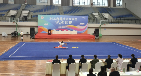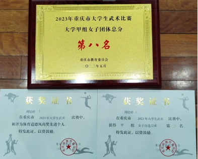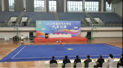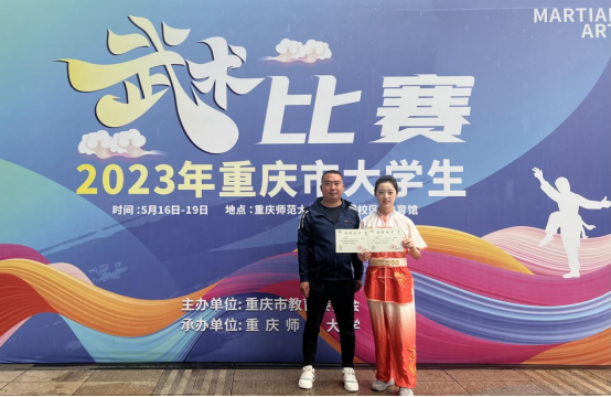 5月16日-19日,2023年重庆市大学生武术比赛在重庆师范大学大学城校区体育馆成功举办。本次比赛由重庆市教育委员会主办,吸引了全市29所高校共计380名运动员和教练员参赛。我校武术队由马克思主义学院院长助理崔文卿领队,专职教师朱从彬担任主教练,周廷婷同学参加本次比赛。在比赛中周廷婷同学发挥稳定、表现突出,赢得评委和观众的阵阵喝彩,最终夺得甲组女子刀术第二名的优异成绩,并被评为体育道德风尚奖先进个人,同时参赛队获得甲组女子团体总分第八名成绩。