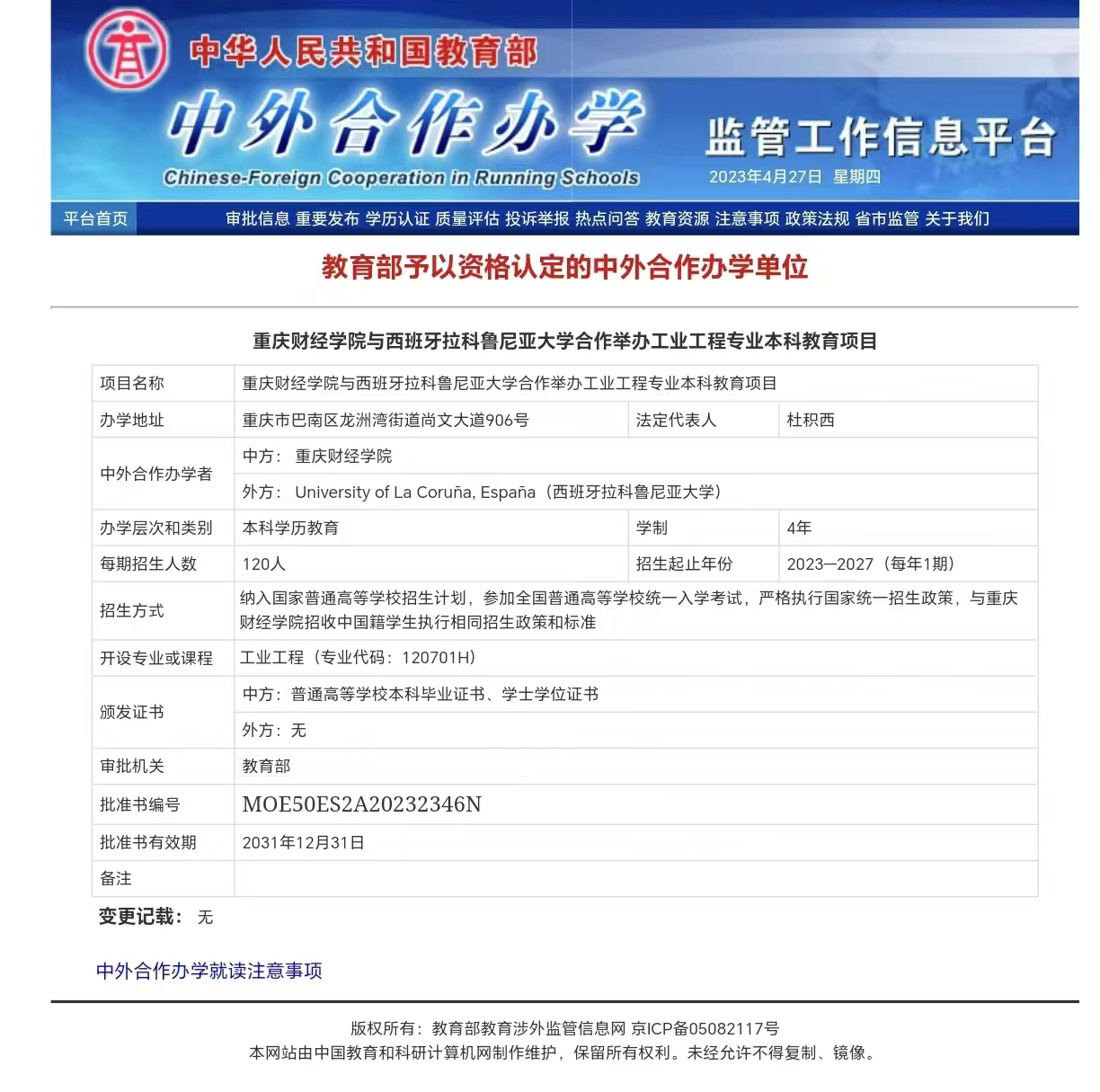 近日,教育部公布2022年下半年中外合作办学项目审批结果,我校与西班牙拉科鲁尼亚大学合作举办的工业工程专业本科教育项目成功获批(批准书编号:MOE50ES2A20232346N)。这是我校获批的首个中外合作办学项目,也是2022年重庆市唯一获批项目,实现了我校中外合作办学项目零的突破,是我校国际化办学的重要里程碑。