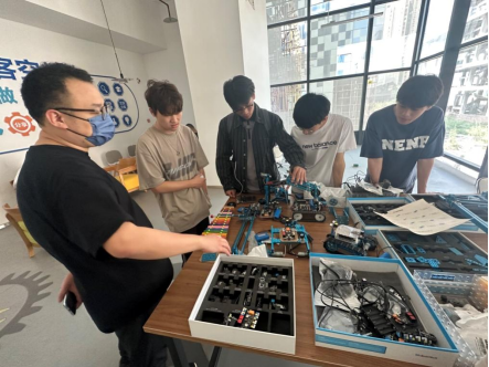 在创客空间内,在指导老师的指导下,学生们将部分人工智能半成品器件组装成实现简单功能的成品,纷纷表示成就感十足。