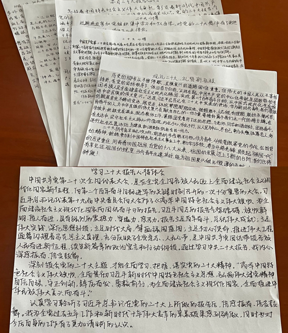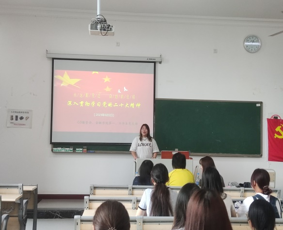 活动伊始,学生党员王笑祎同学围绕党的二十大精神,分别就“过去五年的工作和新时代十年的伟大变革”、“马克思主义中国化时代化”、“中国式现代化”等七个方面进行阐述,通过清晰易懂的案例分析与面面俱到的精神讲解,强调作为当代青年在明白过去五年的工作与新时代十年伟大变革的同时,更应该认清“两大结合”,牢记“六个必须坚持”,从而高效推动全面建设社会主义现代化国家的目标任务。与会同学纷纷表示,回首历史,远望未来,是中国共产党百年奋斗路上的历史经验,我们应积极传承与发扬党的先进理论与成功经验,且在实现第二个百年奋斗目标的新征程上砥砺前行。