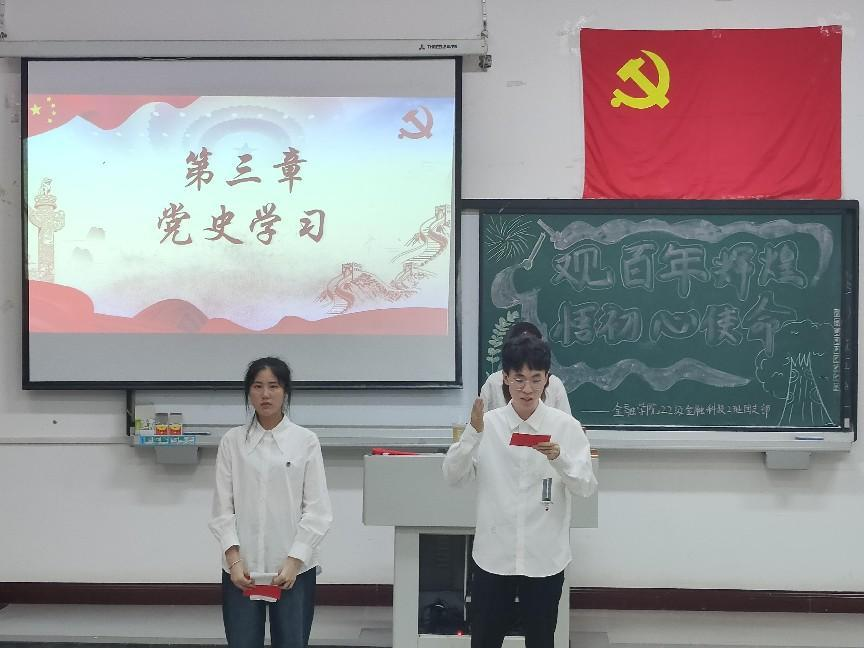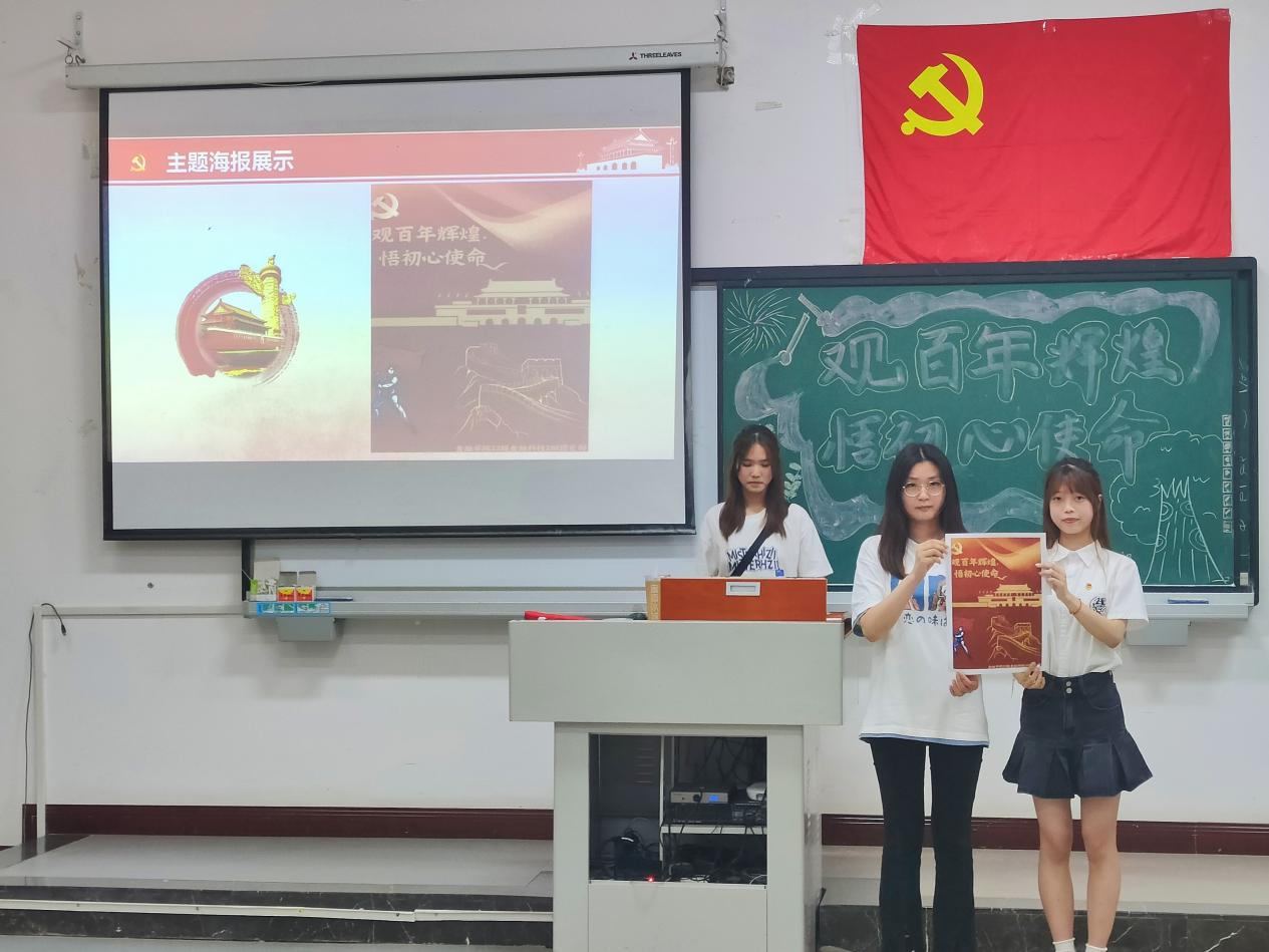 本次活动包含主题海报展示、党史学习、二十大精神讲解、入党宣传教育等环节。首先,学生党员郑翠婷同志与文宣委员郑欣悦同学讲解了主题海报内涵。主持人曹阳同学与柏露同学通过视频展示,阐述了党百年奋斗史的历史意义,带领大家学习党史,并讲解了党的二十大精神。在这个过程中,同学们感悟了“百年辉煌”背后的内涵与真谛,知晓了“惟改革者进,惟创新者强,惟改革创新者胜”的人生哲理,从党的百年伟大奋斗历程中汲取继续前进的智慧和力量,从而更加自信自强、守正创新,踔厉奋发、勇毅前行,踏上实现第二个百年奋斗目标新的赶考之路。