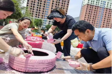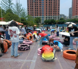 我校党委副书记房朝君,鱼洞街道党工委书记冯天华、莲花街道党工委书记刁维娜及学校200多名青年志愿者参加废旧轮胎彩绘活动。