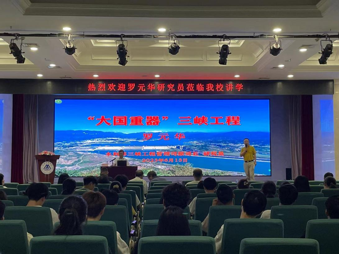 6 月 13 日,水利部三峡工程管理司原司长罗元华研究员莅临我校,以“大国重器”三峡工程为题讲学,重庆市水利局原副局长彭亮陪同。校长吴华安和近 200 名师生聆听了讲座,并进行了互动。讲座由校长助理张立主持。