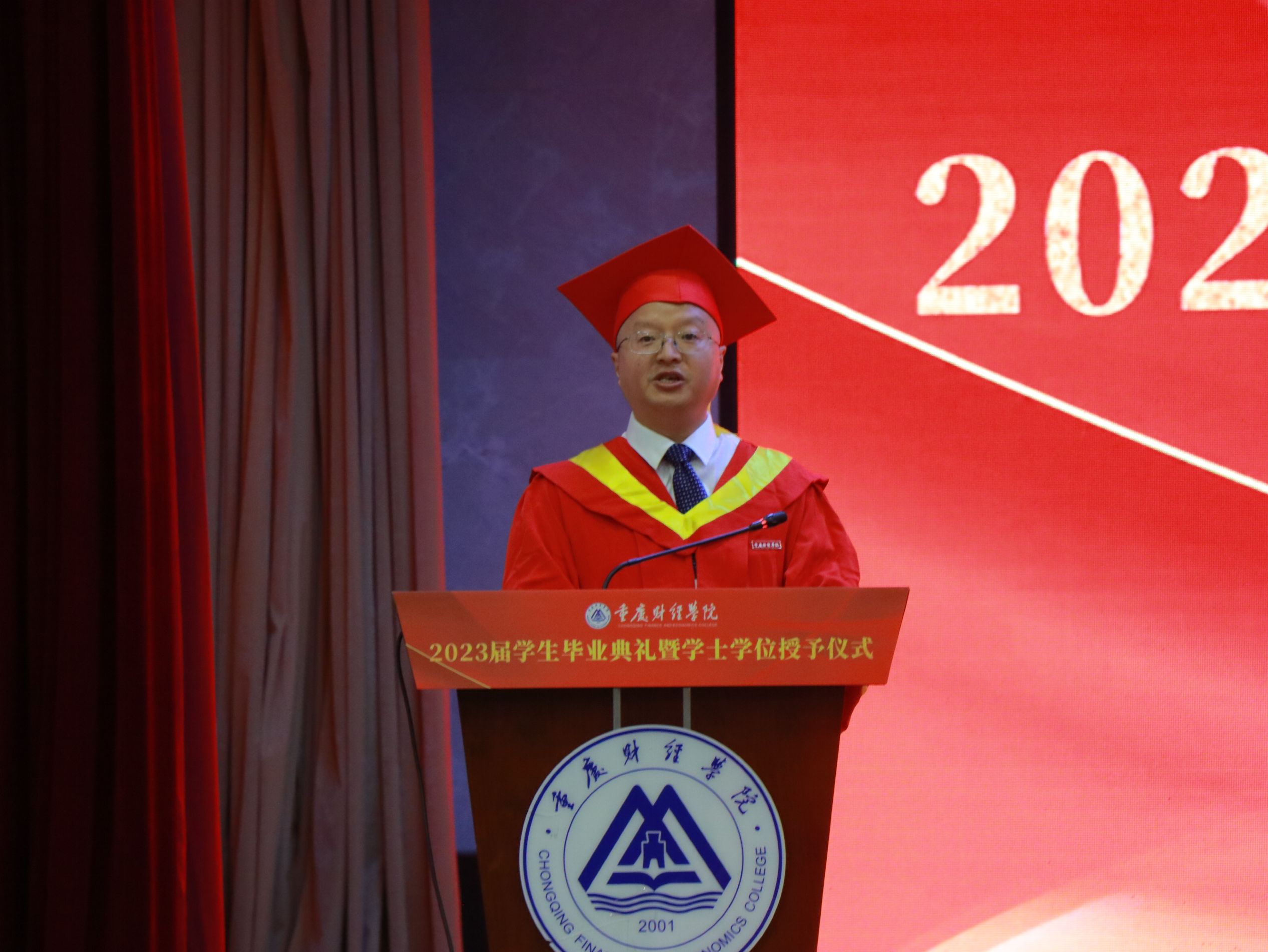 6月16日上午9时30分,我校2023届学生毕业典礼暨学士学位授位仪式在学术报告厅顺利举行。出席活动的领导及嘉宾有全体校领导、学位委员会委员、各二级学院党政负责人、相关职能部门负责人以及教师代表和家长代表,全体2023届毕业班辅导员和毕业生通过线上线下的方式参加本次活动。会议由党委副书记房朝君主持。