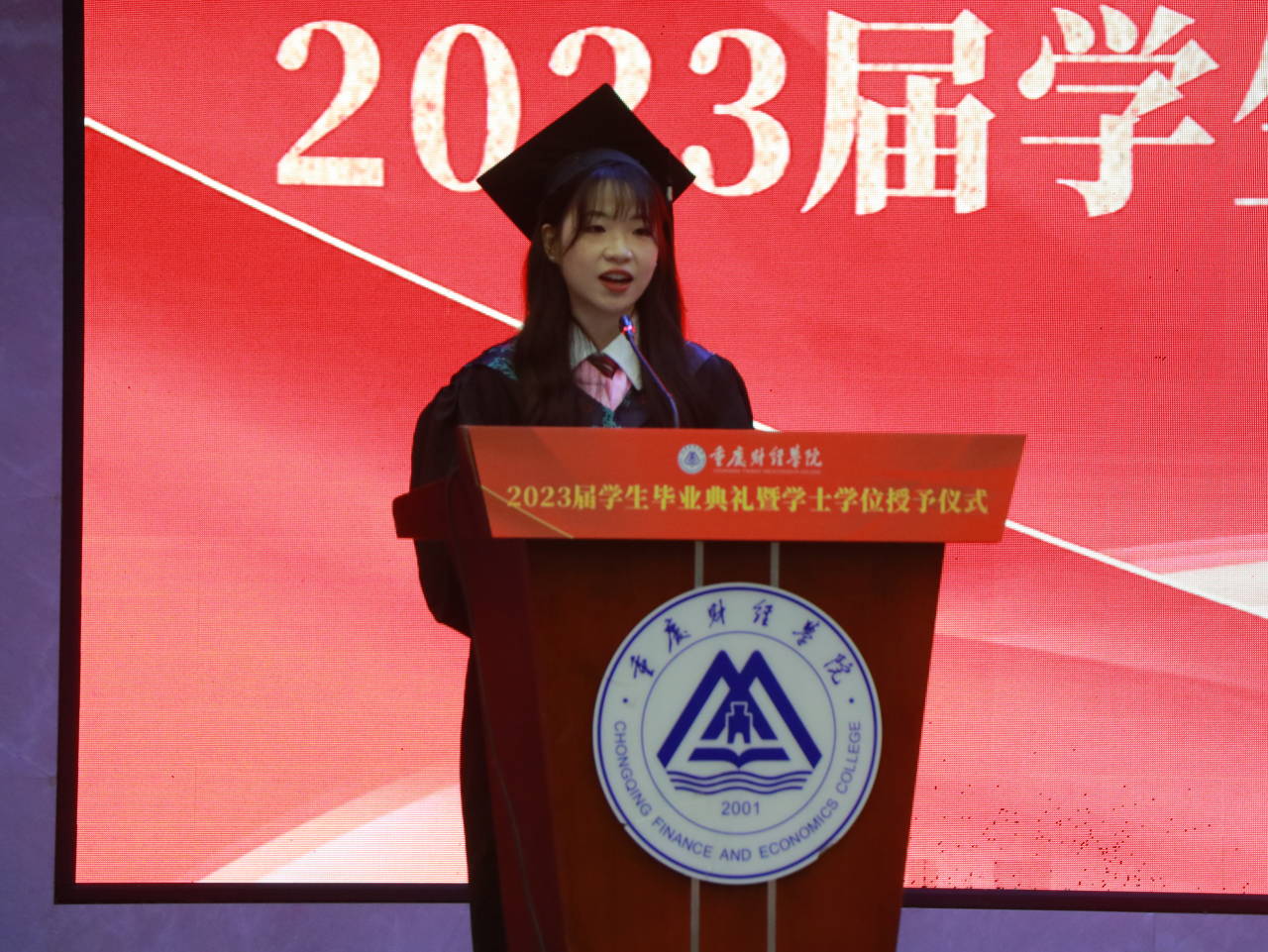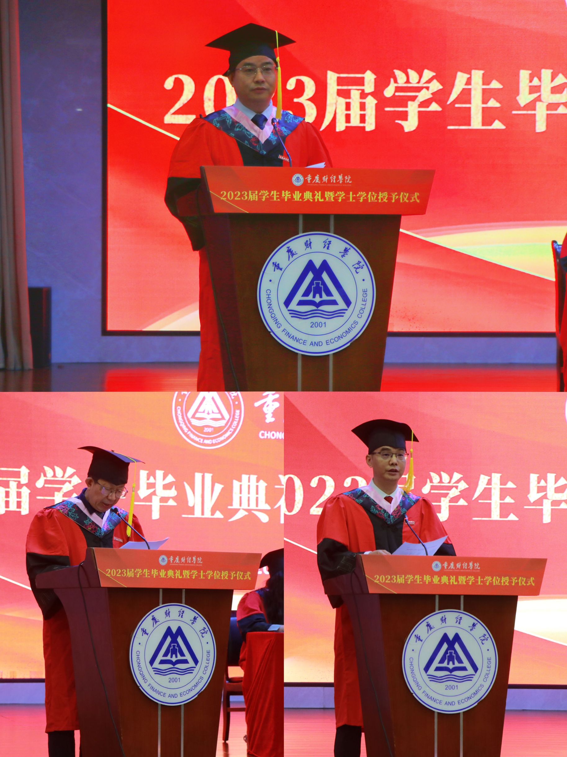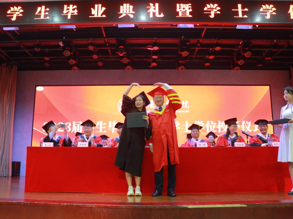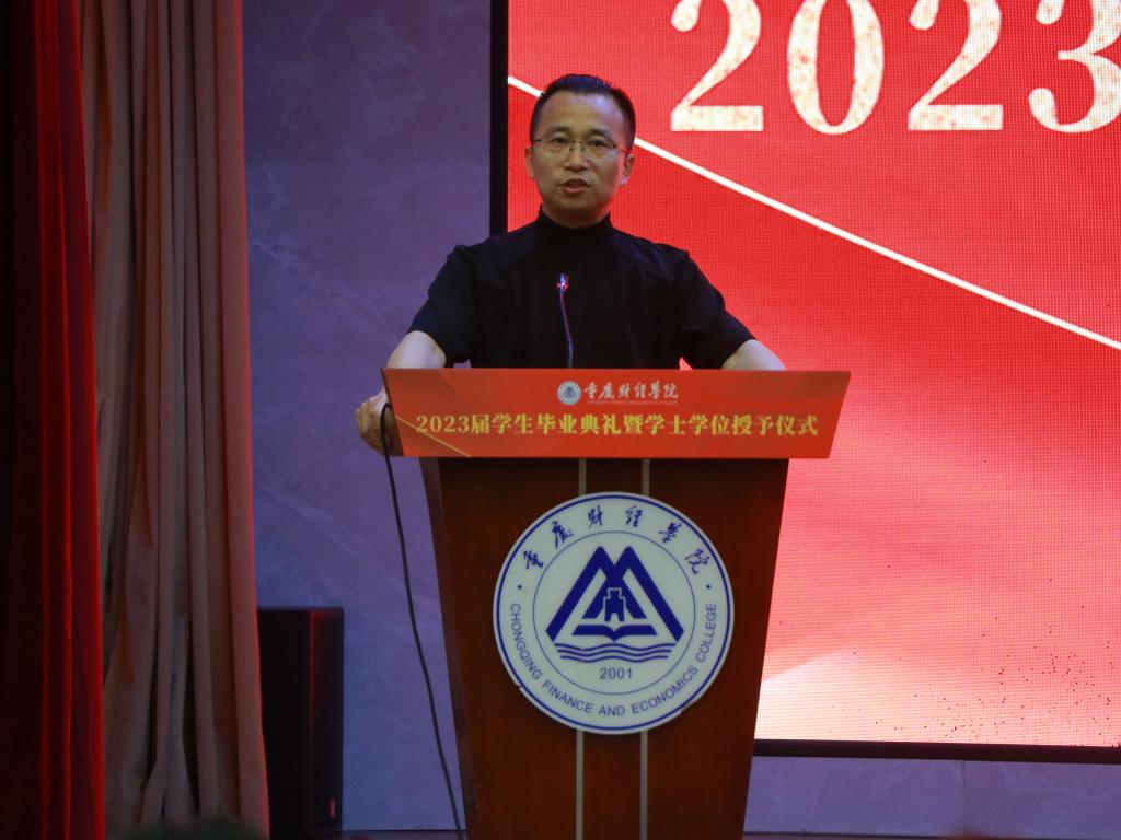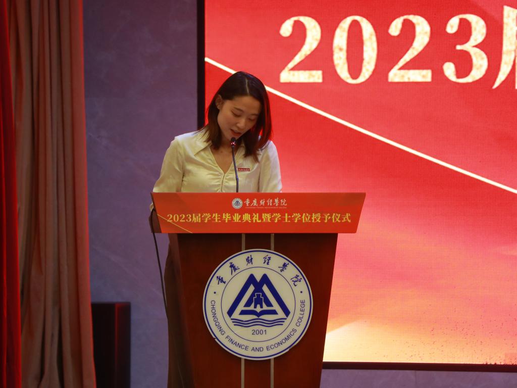 在热烈的掌声中,毕业生代表周心怡同学上台发言,回忆起在校园的种种美好瞬间,尽显对母校的不舍和留恋,表达了对母校与恩师的感谢之情,希望大家以梦为马,不负韶华,绚烂绽放青春之花。毕业生家长代表陈继业为2023届毕业生送上了最诚挚的祝福,肯定了同学们一直以来的努力,并对全校上下表示由衷地感谢,希望众学子懂感恩,知良善,去奋斗,不怕苦不怕难,乘风破浪,直挂云帆。教师代表郭静林副教授对各位毕业生深情寄语,四年来见证了同学们的成长和蜕变,而今后的路要自己走,要善于为自己“投资”,望铭记校训,砥砺前行,自强不息。