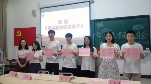 李兰同志为所有毕业生党员发放了《党员政治生日贺卡》,她讲到:“毕业生党员们在校期间始终保持政治初心、勇当政治使命,都是优异的学生榜样,希望同志们在以后要不忘初心使命,牢记责任担当;要牢记党员身份,勇当先锋模范;要幸福生活,快乐每一天,在平凡的生活里,拥抱幸福。”