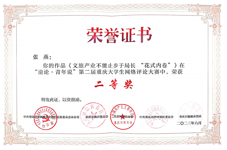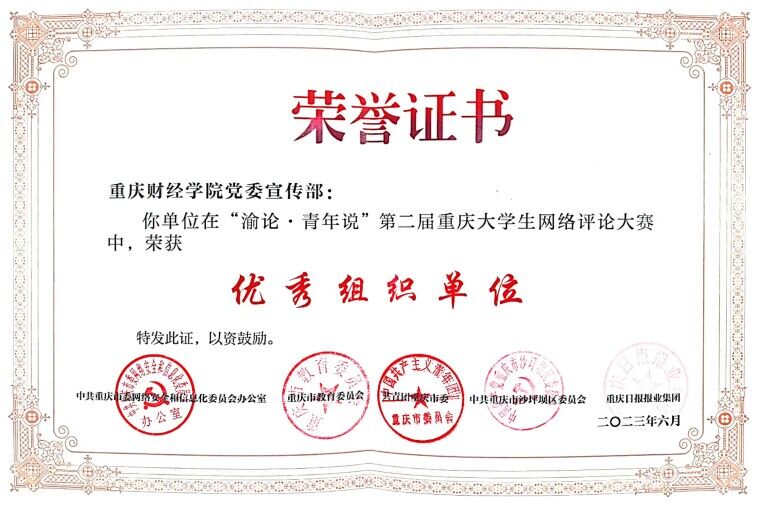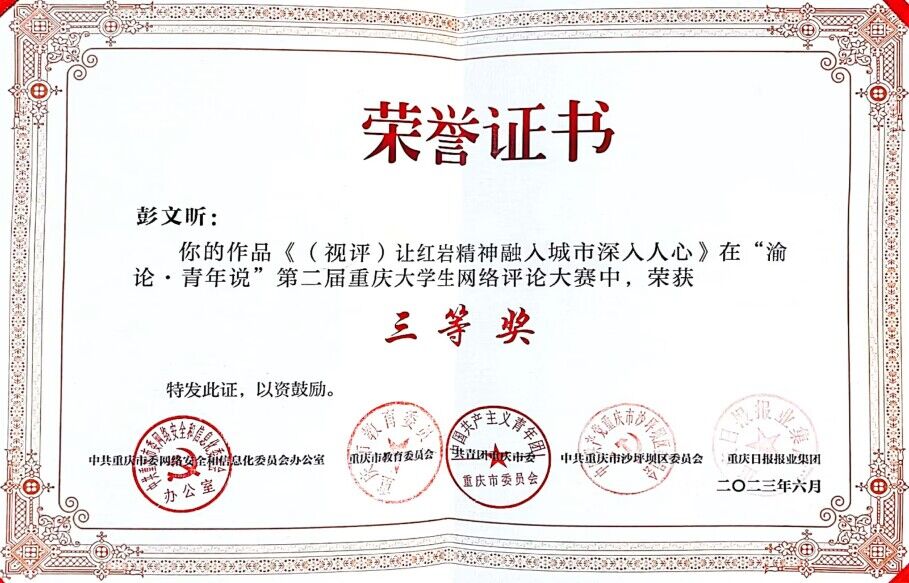 “渝论·青年说”第二届重庆大学生网络评论大赛是由市委网信办、市教委、团市委、沙坪坝区委和重庆日报报业集团联合主办,重庆日报(重庆日报网)承办,全市各高校党委宣传部协办的市级重要赛事,该大赛以网络评论的形式构建青年话语,凝聚青年共识,传播青年声音,为青年话语赋能,开辟了网络舆论引导的青年阵地。在大赛中,我校党委宣传部认真组织、广泛动员,通过深入学院宣讲、落实激励措施、搭建沟通平台、集中培训指导等方式鼓励师生们积极参赛,期间,组织投稿300余篇,在重庆日报公开发表24篇,形成了良好的舆论影响。