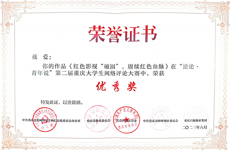 6月20日,“渝论·青年说”第二届重庆大学生网络评论大赛在重庆大学落下帷幕。在此次大赛中,我校荣获二等奖一项、三等奖一项、优秀奖二项,贺高祥、宋钰静获评为指导教师,同时我校宣传部与重庆大学、西南大学等10所高校宣传部一同获评为“优秀组织单位”。