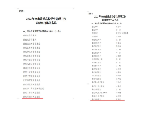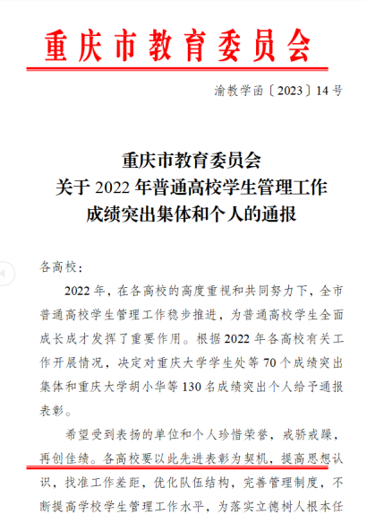 近日,为表彰2022年重庆市普通高校学生管理工作取得的显著成效,重庆市教育委员会印发《重庆市教育委员会关于2022年普通高校学生管理工作成绩突出集体和个人的通报》(渝教学函〔2023〕14号),我校学生处被评为“学生日常管理工作成绩突出集体”,会计学院姚转花同志获评“学生日常管理工作成绩突出个人”其中“学生日常管理工作成绩突出集体”学生处已连续次获得。