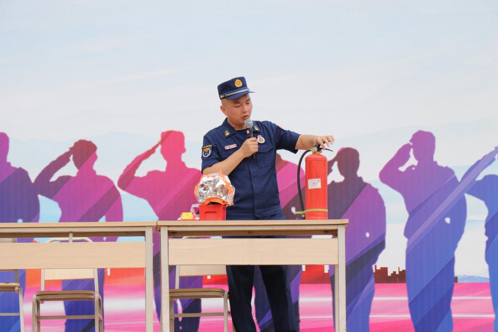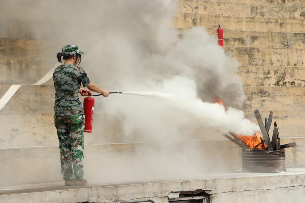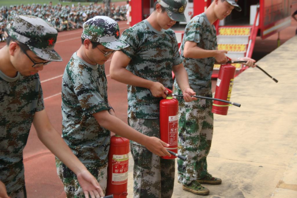 接着,张参谋向大家演示了灭火器的用法,很多同学纷纷积极举手请求体验,其中20名同学出列体验灭火器。由安保处配合演习、负责点火;在确保灭火器气压正常的情况下,同学们拔下保险销,将其拨到喷口前端,站至上风2米处,对准火源根部扫射,成功灭火。