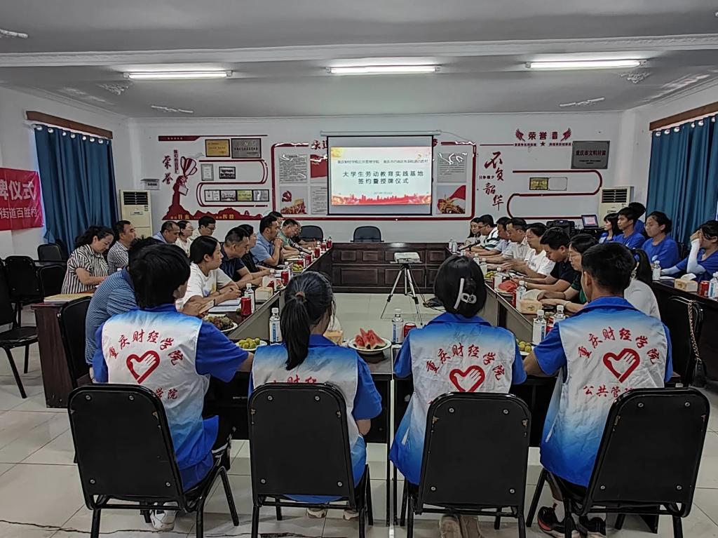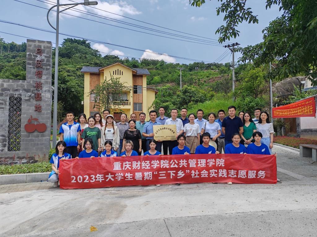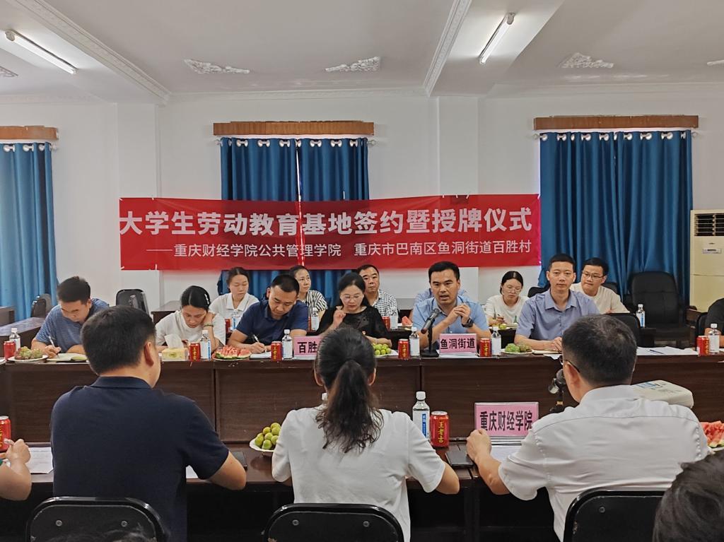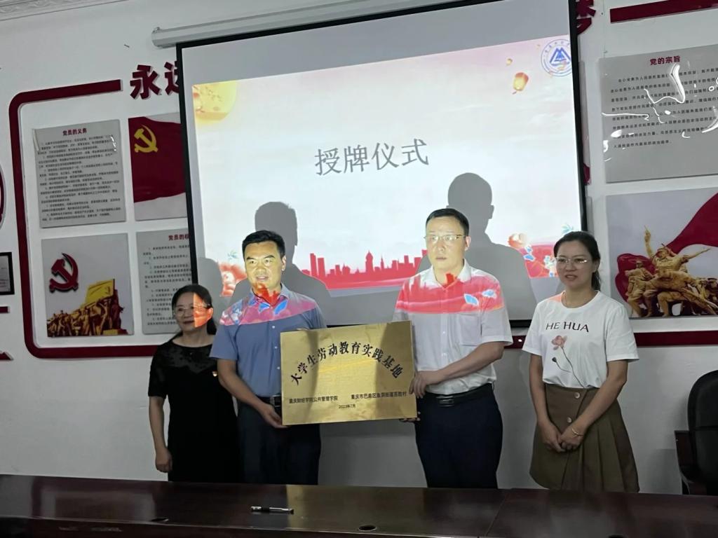 7月10日,我校公共管理学院与重庆市巴南区鱼洞街道百胜村“大学生劳动教育实践基地”签约暨授牌仪式在百胜村村委会举行。本次活动是深入贯彻落实教育部全面加强新时代大中小学生劳动教育的要求,丰富劳动教育实践活动的形式,拓展劳动教育实践场所。巴南区鱼洞街道办事处党工委书记冯天华、百胜村党委书记扬正明以及村委相关负责人;我校副校长李春雷、公共管理学院党总支副书记李兰及“党建引领·百村振兴”社会实践服务团全体成员出席此次仪式。