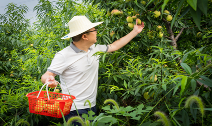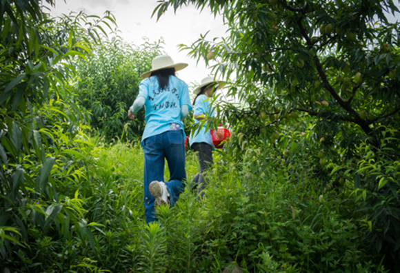 在巴南区红炉村桃李庄园里,满园尽是一株株挂满香桃的果树,一颗颗个头饱满的香桃压弯了枝头,果园深处的当地居民们正忙着采摘、装筐,一派丰收景象。服务团成员头戴草帽顶着烈日,在果树林中穿梭,仔细辨别枝头香桃是否饱满完整,成员们双手提着一筐筐饱满的香桃满载而归,队员们用汗水浸润着这片桃园,用自己的行动去助力乡村振兴。