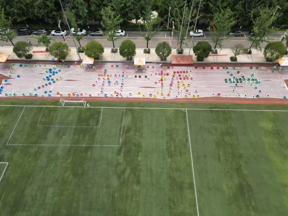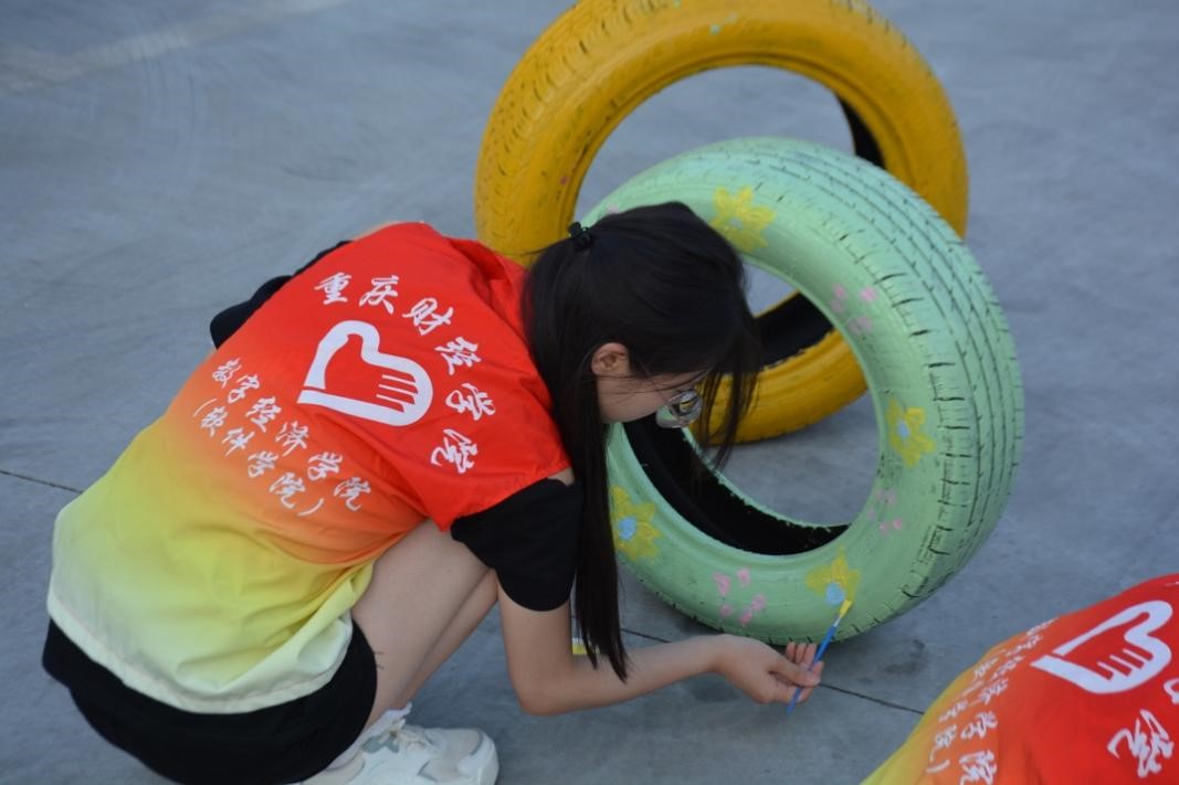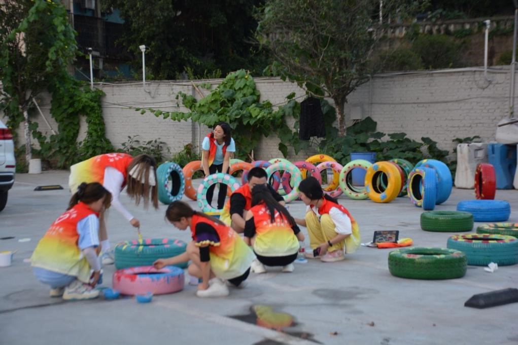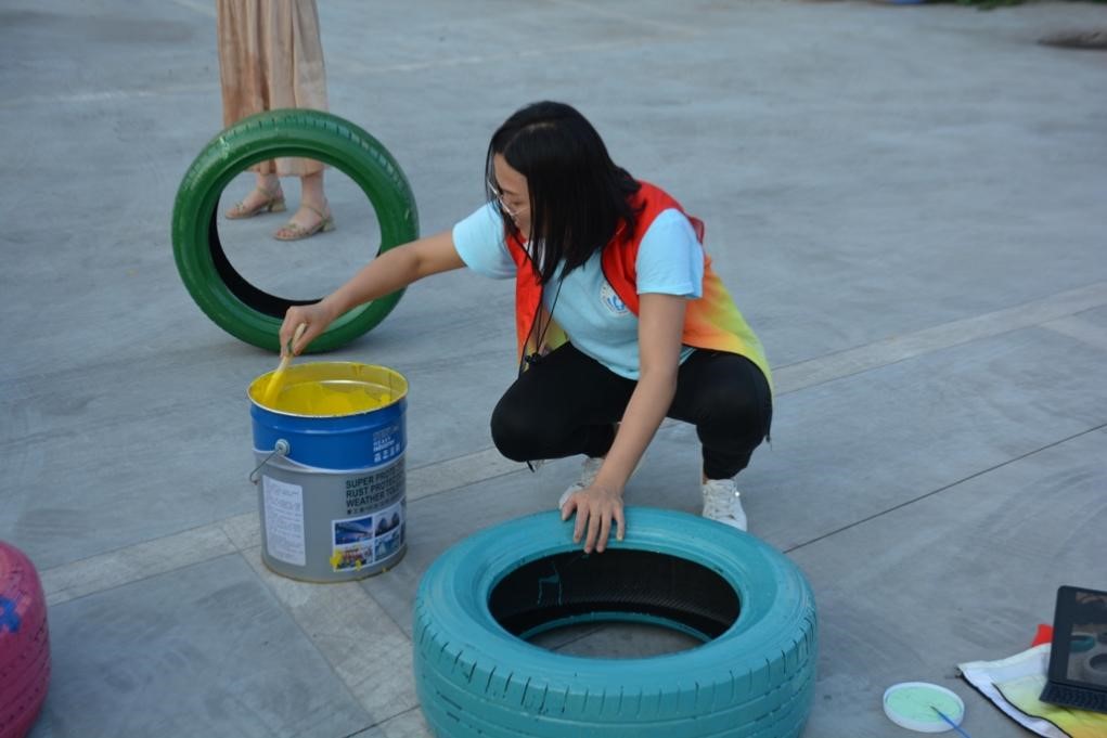 活动前期,志愿者们在学校操场上将200多个轮胎全部上色,他们克服着烈日高温和彩漆染衣等困难,充分利用绘画工具对轮胎进行涂色、勾勒,一条条废旧轮胎经志愿们巧手绘画后焕然一新。