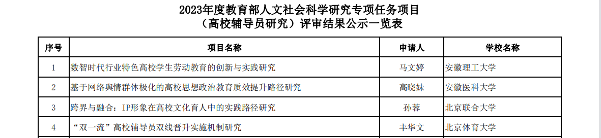 9月15日,教育部社科司对2023年度教育部人文社会科学研究一般项目评审结果进行了公示,我校财富管理学院书记宋钰静申报的《样板支部在高校学生思政教育中的示范引领作用研究》入围高校辅导员研究专项。
