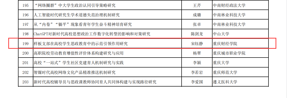 该专项任务项目实行限额申报,经专家评审,全国最终确定高校辅导员研究项目获批203项,其中重庆市高校共获批5项。近年来,我校财富管理学院发挥基层党建对人才培养的引领作用,学生党支部先后获批重庆市首批高校党建样板支部、第三批全国党建工作样板支部、党总支获批重庆市第二批标杆院系、重庆市先进基层党组织。入围教育部人文社科项目,是对育人实践的理论升华。