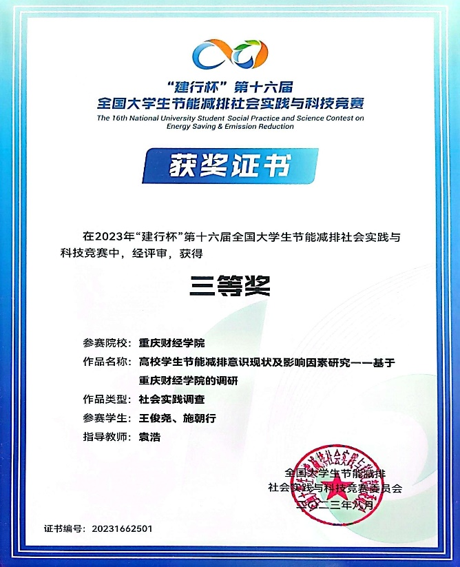 近日,“建行杯”第十六届全国大学生节能减排社会实践与科技竞赛落下帷幕,我校送选的社会实践调查类作品《高校学生节能减排意识现状及影响因素研究—基于靠谱的电子游戏官网的调研》、《数字经济背景下重庆市农业绿色发展水平测度及障碍因子识别》荣获国家级三等奖。