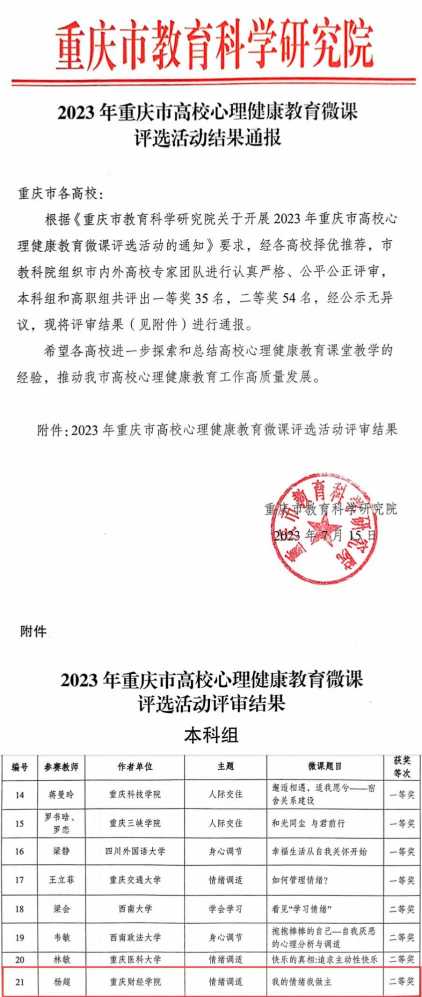 9月25日,由重庆市教育委员会,重庆市教育科学研究院主办,重庆市九龙坡区教育委员会承办的2023年重庆市大中小学心理健康教育教学展示暨教研工作会在重庆市谢家湾学校举行。会议公布了2023年重庆市高校心理健康教育微课获奖人员名单,我校经济学院辅导员杨超老师荣获本科组二等奖。