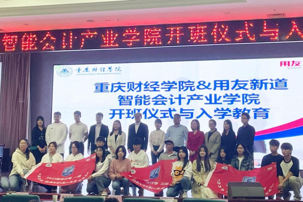 为推动产业学院发展,进一步深化产教融合,帮助2023级新生了解智能会计专业明确学习目标。10月9日,我校智能会计产业学院学术报告厅举行2023级开班仪式与入学教育。会计学院院长李倩、会计学院党总支书记姚转花、会计学院院长助理杨瑞丽、会计系主任刘贤洲、会计系副主任王秀霞、新道科技股份有限公司副总裁宋健、重庆分公司总经理徐福年、教学服务总监李志良、校企合作经理莫正海、驻校导师朱小芳参加本次开班仪式。