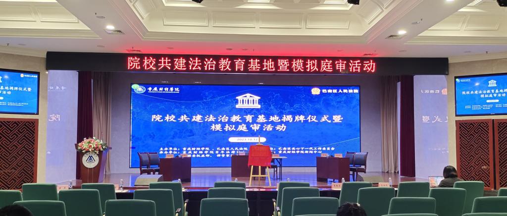 为深学笃用习近平法治思想,全面贯彻党的教育方针,进一步加强学校法治工作建设,10月12日13:00,我校与巴南区人民法院共建法治教育基地揭牌仪式暨模拟庭审活动在教学楼学术报告厅举行。巴南区关心下一代工作委员会副主任陈先觉、巴南区人民法院副院长刘秀荣、立案庭副庭长吴继超,我校副校长李春雷及相关部门负责人出席本次活动。