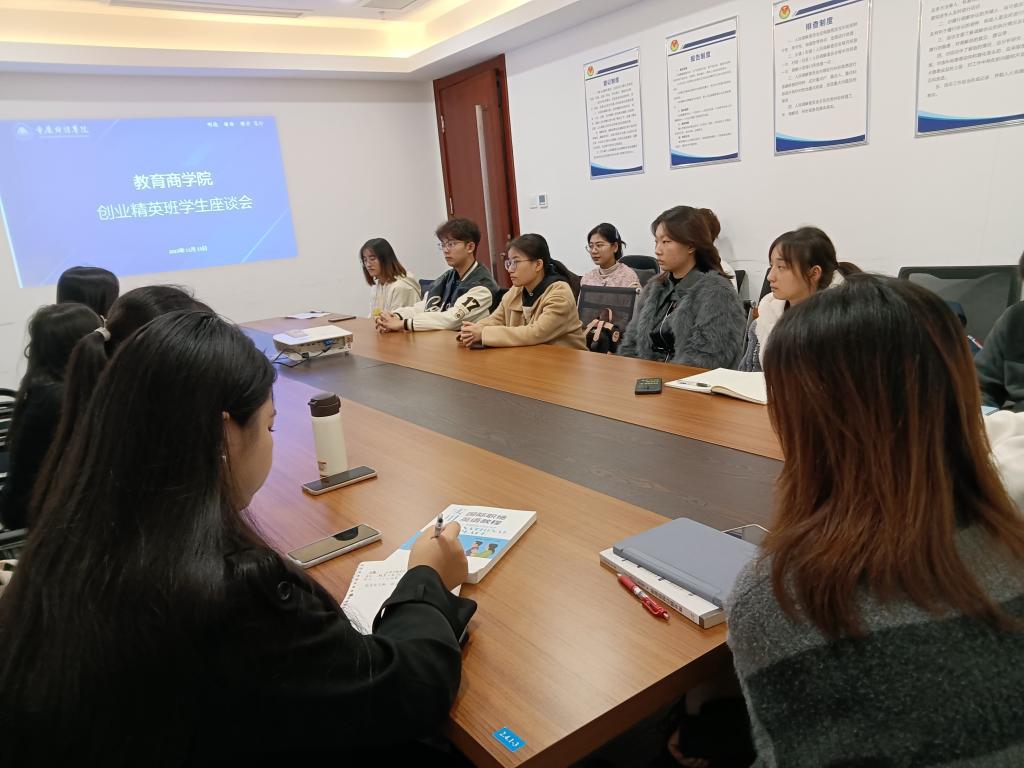 为调研创业精英班课程开展情况,了解班级学生学习效果及需求,有效提高课程教学质量,11月13-14日,教育商学院在行政楼2401会议室分别召开创业精英班学生座谈会与教师座谈会。教育商学院院长曾真、双创中心主任莫紫霄、创业精英班班级成员教师及学生代表参加会议。