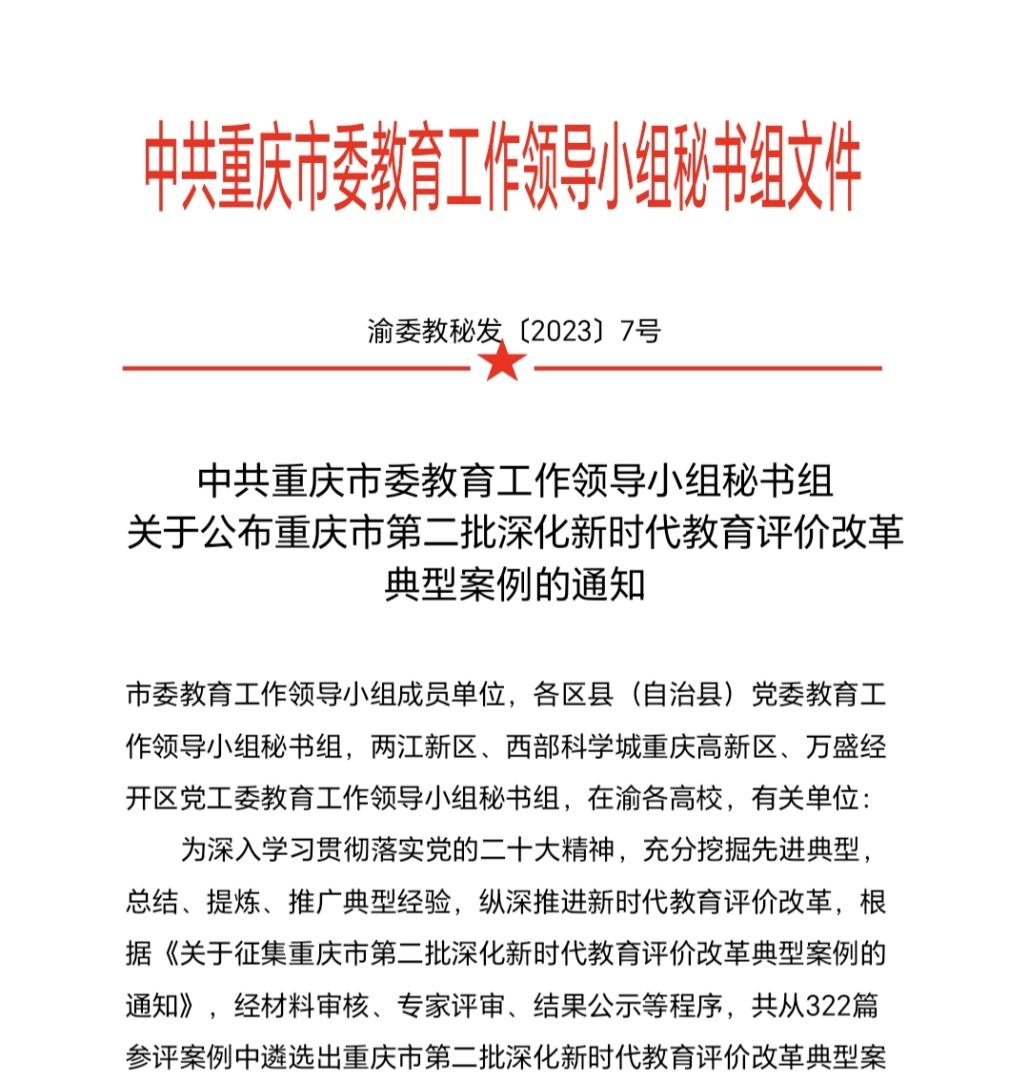 近日,中共重庆市委教育工作领导小组秘书组印发《关于公布第一批重庆市深化新时代教育评价改革典型案例的通知》(渝委教秘发〔2023〕7号),市委教育工作领导小组成员单位及各区县、高校、有关单位共提交案例322个,经材料审核、专家评审、结果公示等程序,共遴选出重庆市第二批深化新时代教育评教改革典型案例81个,其中特等奖10个,一等奖15个,二等奖26个,三等奖30个。我校案例成果《“三路径”深化学生奖励荣誉体系改革,强化示范引领育人效果》荣获市级“二等奖”。