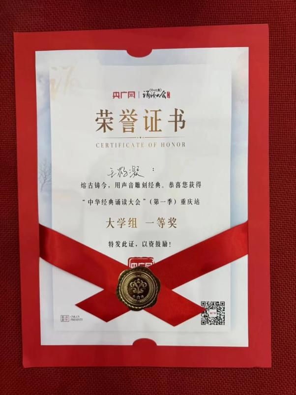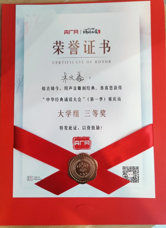 近日,第一季中华经典诵读大赛重庆赛区总决赛顺利举行。新媒体艺术学院2022级播音一班王鹤凝、朱汶鑫两位同学在重庆赛区众多优秀参赛选手中脱颖而出,分别获得本次大赛的一等奖及三等奖。