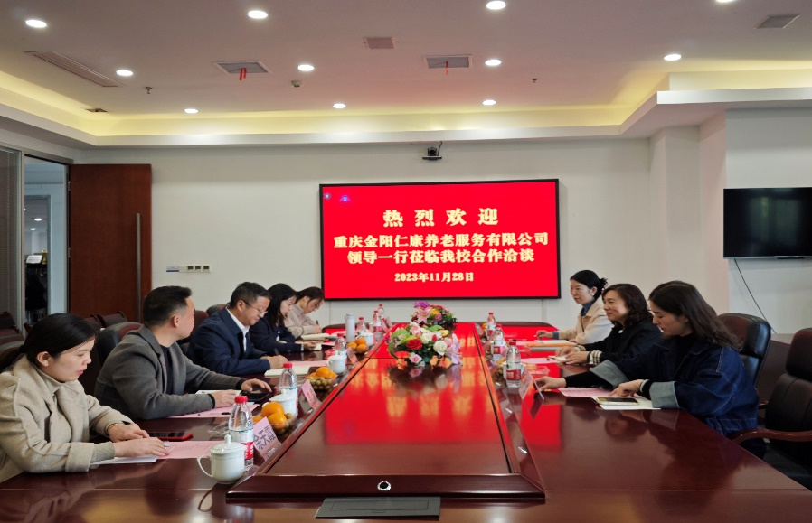 吴华安校长代表学校对重庆金阳仁康养老服务有限公司一行表示热烈欢迎,并介绍了学校的发展历史、办学特色及建设成就,提出了“一专一企”校企共谋的新合作建设理念。他表示,近年来学校充分发挥专业优势,积极主动探索应用型人才培养新模式,不断提升高校服务地方发展效能,夯实践行学校“扎根巴南、融入巴南、服务巴南”理念。随着社会老年化程度的不断深化,高质量健康养老服务是现代社会发展的必要,学校愿与企业一起积极探寻,共同打造从“养老”到“享老”的高质量康养服务保障体系。