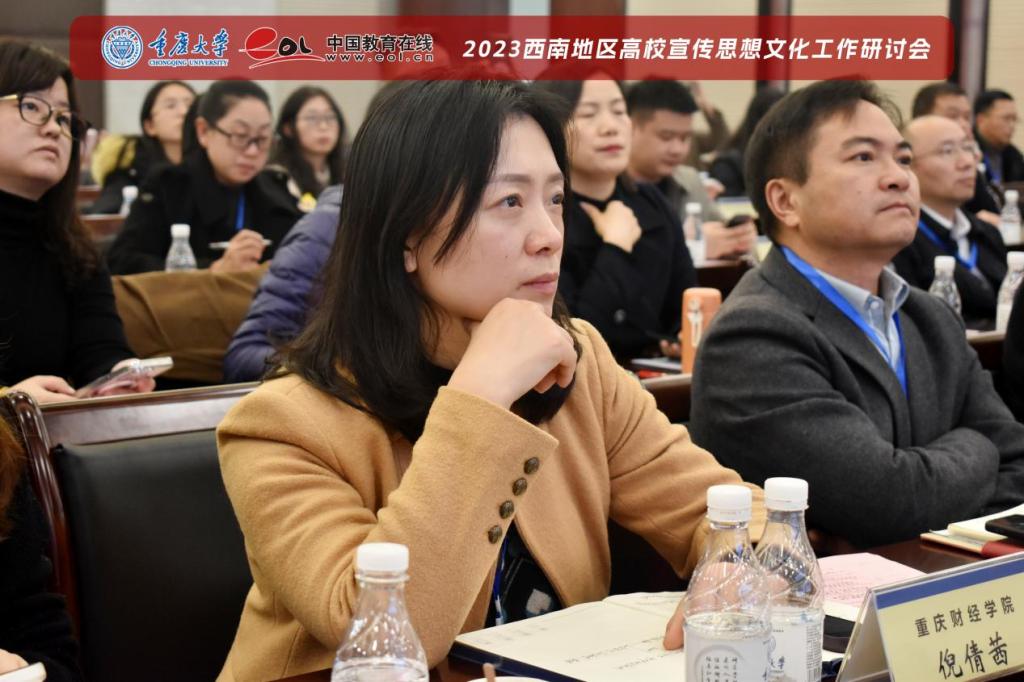 12月6日下午,由教育部高校思想政治工作创新发展中心(重庆大学)、中国教育在线联合主办的2023西南地区高校宣传思想文化工作研讨会在重庆大学召开,来自西南地区的50余所高校近100余名从事宣传工作的骨干参加此次会议,会议以“学习贯彻习近平文化思想,促进高校校园文化提质增效”为主题。我校党委宣传部部长倪倩茜、党委宣传部综合科科长颜萌萌参与此次会议。