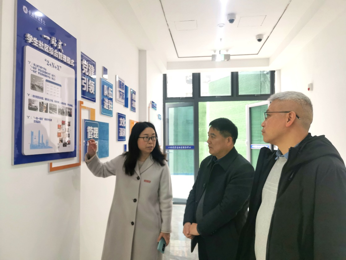 检查期间,严处长一行深入学生公寓,现场调研“一站式”学生社区建设情况。党委副书记房朝君从“党建引领、队伍入驻、学生参与、条件保障”等方面介绍了我校“一站式”学生社区建设情况和工作成效,重点围绕服务“平台”、楼宇 “活动室”和“工作室”、校外“一院一镇街”实习实践基地三方面,细致讲解了我校“2+N+X”学生社区综合管理模式。