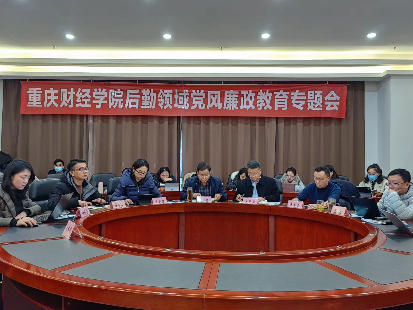 为深入学习贯彻习近平总书记全面从严治党思想,落实全市教育系统后勤领域“以案四说”警示教育会要求,进一步加强学校干部队伍建设1月9日下午,学校后勤领域党风廉政教育专题会在2302会议室召开。学校党委书记张毅,党委委员、校长吴华安,副书记房朝君,党委委员、副校长李春雷,党委委员、副校长崔中山,党委委员、副校长张立,党委委员、党委宣传部部长倪倩茜,全体中层干部及后勤领域等关键岗位人员参加会议。会议由房朝君副书记主持。
