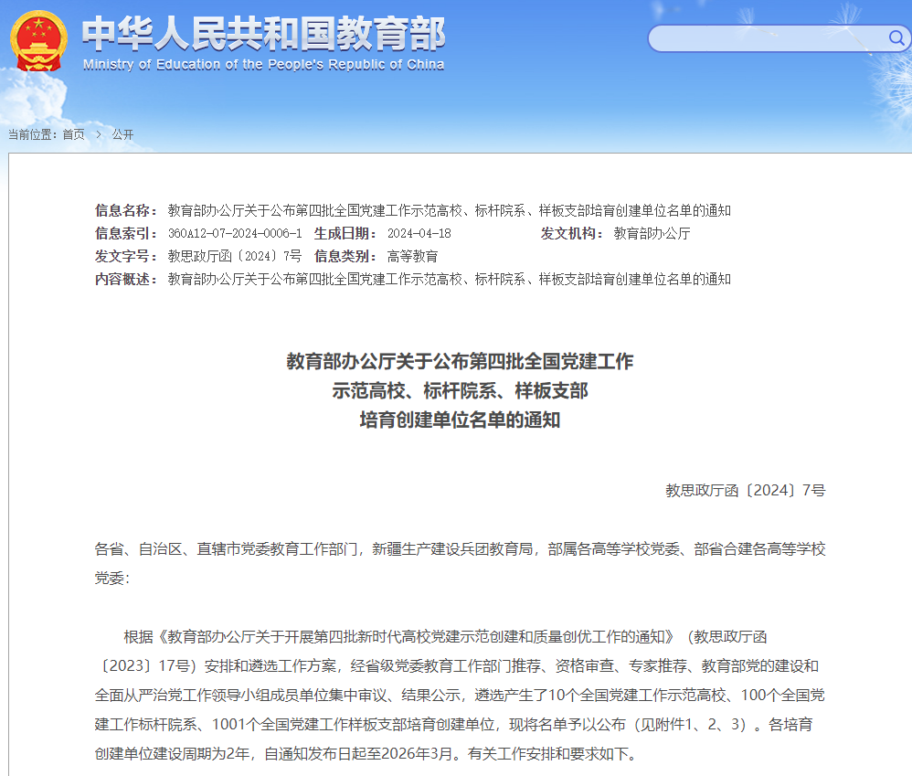 新时代高校党建示范创建和质量创优工作(以下简称新时代高校党建“双创”工作),是教育部面向全国普通高等学校党委及其院(系)党组织、基层党支部开展的新时代高校党建示范创建和质量创优工作。本次获批的创建单位,是经过省级党委教育工作部门推荐、资格审查、专家评审、教育部党的建设和全面从严治党工作领导小组成员单位集中审议后遴选产生。
