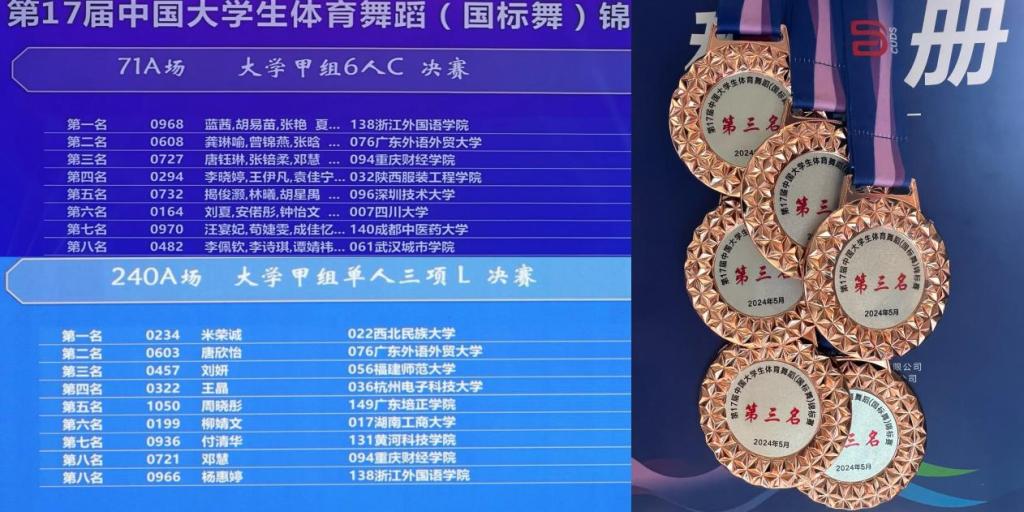 中国大学生体育舞蹈(国标舞)锦标赛,作为全国高校体育舞蹈的顶级赛事。在为期4天的团体和单项激烈竞赛中,队员们团结协作、奋勇拼搏、斗志昂扬、沉着应战、积极进取,纷纷闯入半决赛和决赛圈。其中,唐钰琳、黄荟霖、张培柔、邓慧、张谙馨和匡欣墁同学经过多轮的角逐获得大学甲组6人组C第三名,邓慧同学获得大学甲组单人三项L第八名的成绩。