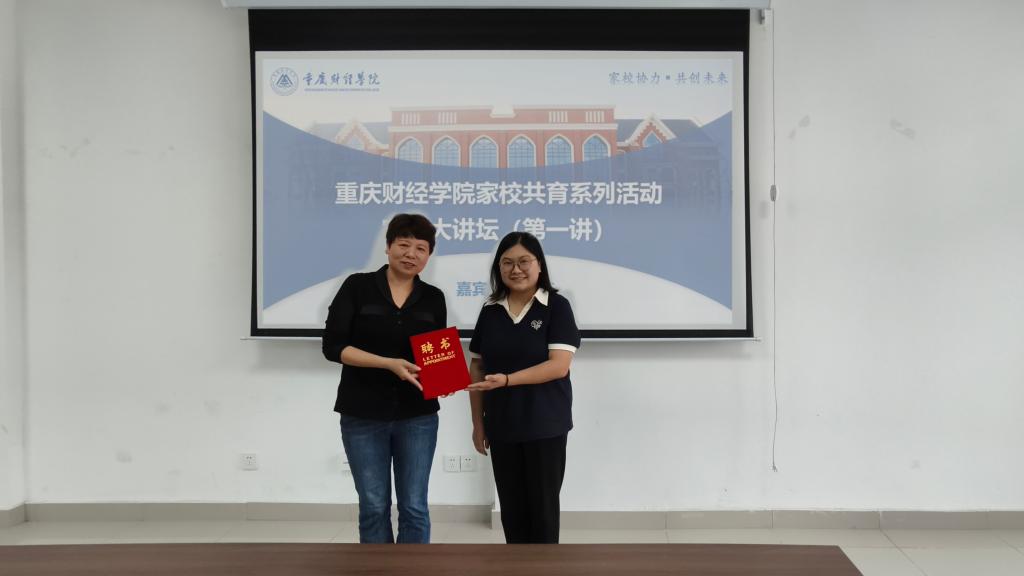 最后,学生工作部部长唐川川作活动总结并为嘉宾颁发聘书。唐川川提到张耳英家长在此次活动中以“校、社、家”3个不同的身份与同学们进行走心交流,作为会计专业前辈,以张老师的角度出发告诉同学们如何学习;作为企业总经理,以张总的角度出发告诉同学们如何工作;作为一个母亲,以张妈妈的角度出发告诉同学们如何做人。希望同学们在整个交流中有所感悟,化思想为行动,争做“行动派”。