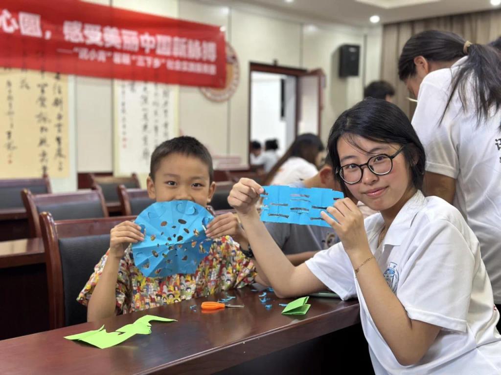 国际商学院的实践团成员们将课堂转入了非遗剪纸体验,孩子们与志愿者相互配合,共同剪出一幅幅充满创意与传统韵味的作品,让小朋友回归中国传统文化,为他们种下一颗文化自信的种子。