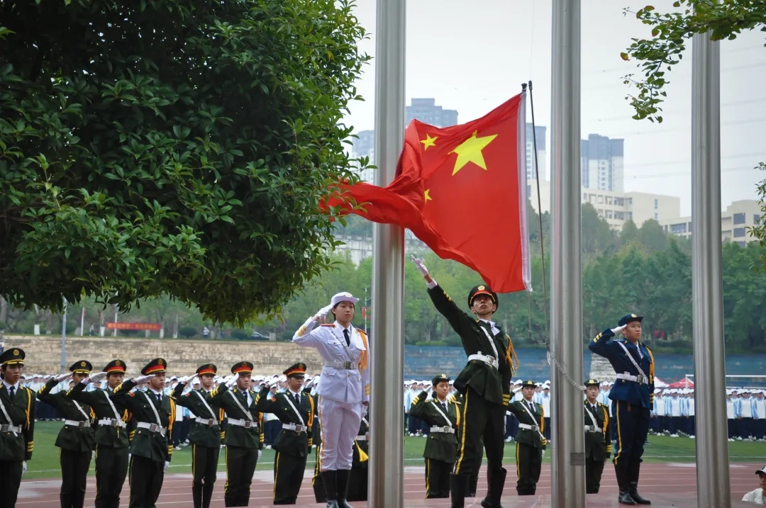 开学典礼暨军训动员大会在激昂的国歌声中拉开帷幕。五星红旗冉冉升起,庄严肃穆;全体人员行注目礼并齐唱国歌。