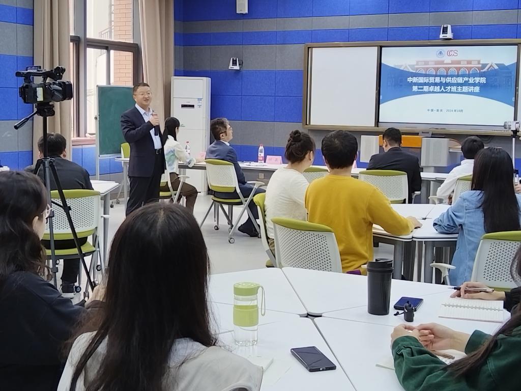 10月24日,我校中新国际贸易与供应链产业学院(以下称产业学院)第二期卓越人才班主题讲座在教学楼1220智慧教室顺利举行。讲座由新加坡企业发展局(以下称新加坡企发局)中国司华西区商务经理胡晨与重庆市商务委中新物流航空处副处长郑弦主讲。新加坡企发局中国区副司长叶栢安,中新互联互通(重庆)物流发展有限公司企业导师代表,我校校长吴华安、物流工程学院院长刘岱、副院长陈郑霖,卓越人才班导师团队和全体学员参加讲座。