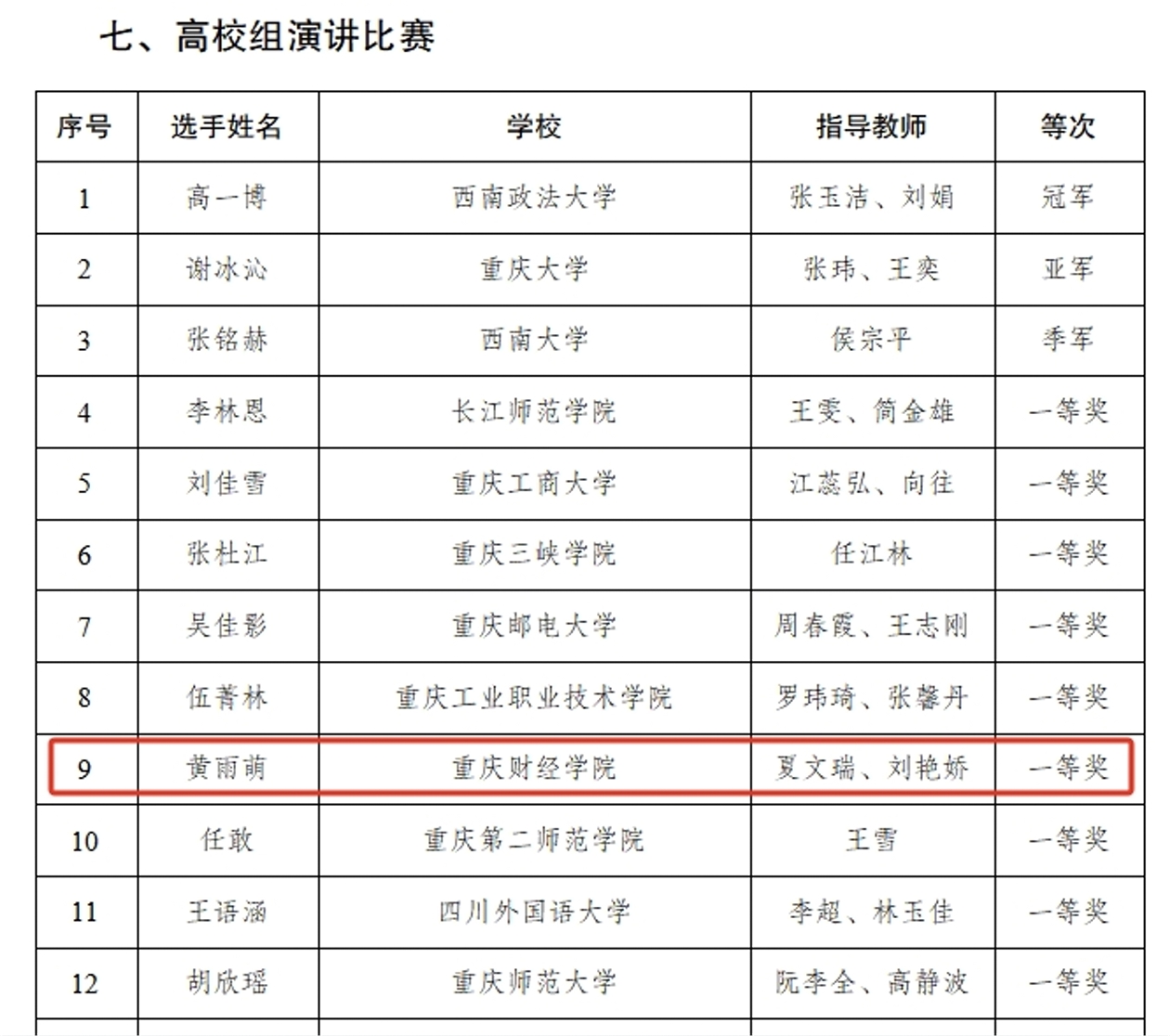近日,由重庆市教育委员会主办的第九届全国学生“学宪法 讲宪法”活动重庆市决赛圆满落幕。我校黄雨萌同学荣获高校组演讲比赛一等奖,我校荣获团体二等奖,实现了我校在此项赛事中的历史性突破。