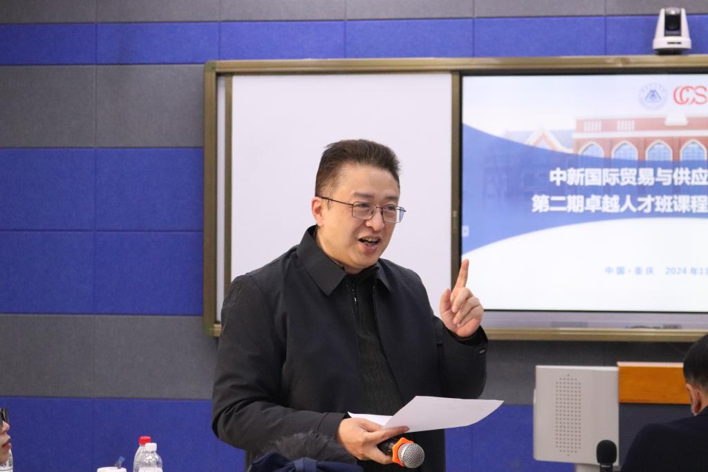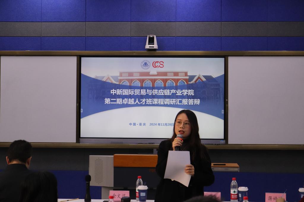 2024年11月28日上午,我校中新国际贸易与供应链产业学院(以下简称产业学院)第二期卓越人才班课程调研实践汇报答辩会在教学楼1220教室顺利举行,学生为期四周的项目式课程调研实践,迎来了最后的检验。中新互联互通(重庆)物流发展有限公司总经理金文迅、副总经理陈晞等企业导师,我校党委副书记房朝君、国际合作与交流处、教务处、物流工程学院相关人员及第二期卓越人才班全体学员参加会议。