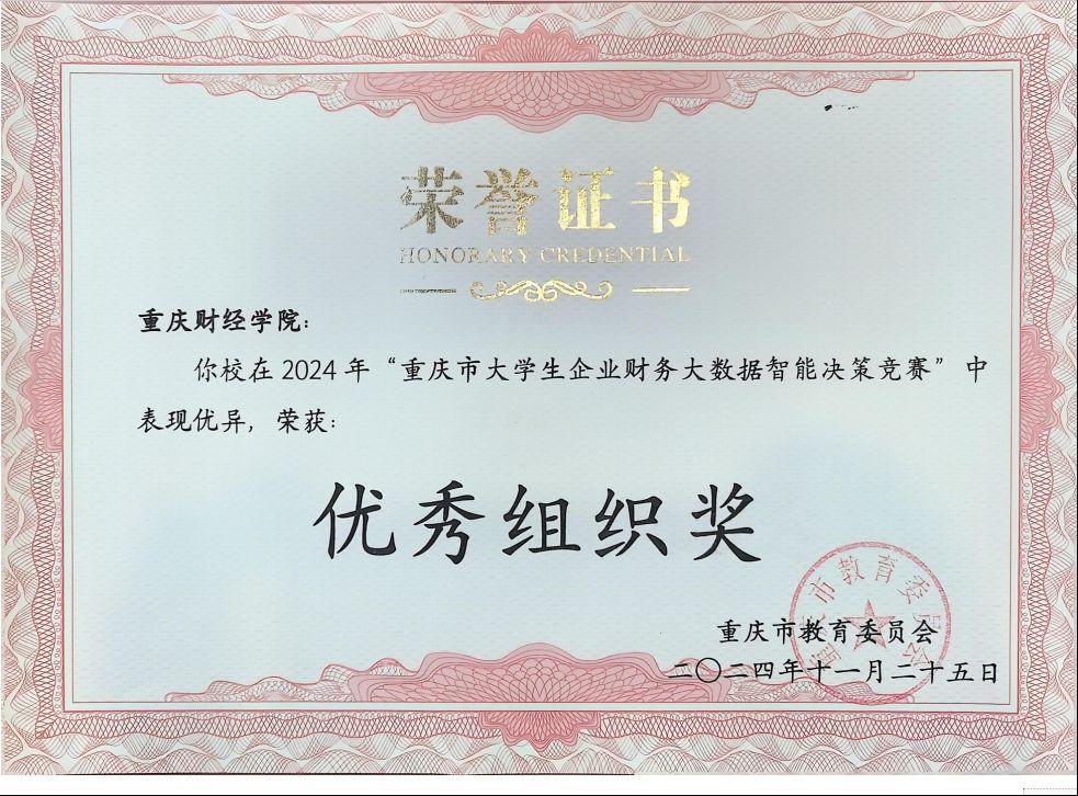 近日,由重庆市教育委员会主办,重庆师范大学承办,教育部会计信息化课程虚拟教研室、金蝶精一信息科技服务有限公司协办的“2024年重庆市大学生企业财务大数据智能决策竞赛”圆满落幕。本次大赛吸引重庆大学、重庆师范大学、重庆理工大学、重庆电子工程职业学院、重庆财经职业学院等32所高校82支代表队参赛,经过激烈角逐,我校会计学院廉然和陈凤老师指导的刘宁铃、付晓燕、唐小芳组成的壹队表现出色,荣获省赛三等奖,我校也荣获优秀组织奖,这是我校首次在此类大赛中获奖。