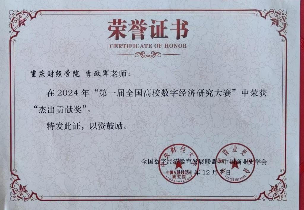 本大赛紧扣数字技术与经济学理论,聚焦数字经济发展的前沿课题,顺应中国经济高质量发展的时代需求,着力培养适应数字经济动态发展需求的高层次创新人才。大赛吸引了全国众多高校学子的积极参与,竞争异常激烈。经过激烈角逐,我校代表队表现优异,胡斌航同学荣获“学术论文个人赛优秀奖”,于莉、谢周飞等同学荣获“项目分析小组赛优秀奖”,我校经济学院李政军院长因其对赛事的突出贡献,被大赛组委会授予“杰出贡献奖”。