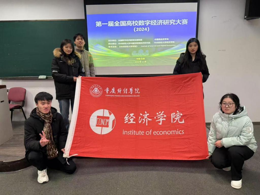 12月7日,我校经济学院青年教师于凯迪博士领队,带着胡斌航、于莉、谢周飞等5名学生代表学校前往中央财经大学,参加由全国数字经济教育发展联盟和全国商业史学会举办的“第一届全国高校数字经济研究大赛(2024年)”全国总决赛。