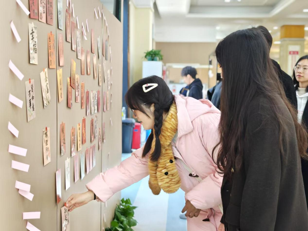 上午11时,活动正式拉开帷幕。书法爱好者们现场挥毫泼墨,为同学们送上了一幅幅寓意吉祥的春联。这些春联不仅展示了书法艺术的魅力,更传递了新年的美好祝愿。同时,有兴趣的同学也积极参与即兴创作,用笔墨书写自己的新年心愿,为活动增添了一抹浓厚的文化色彩。
