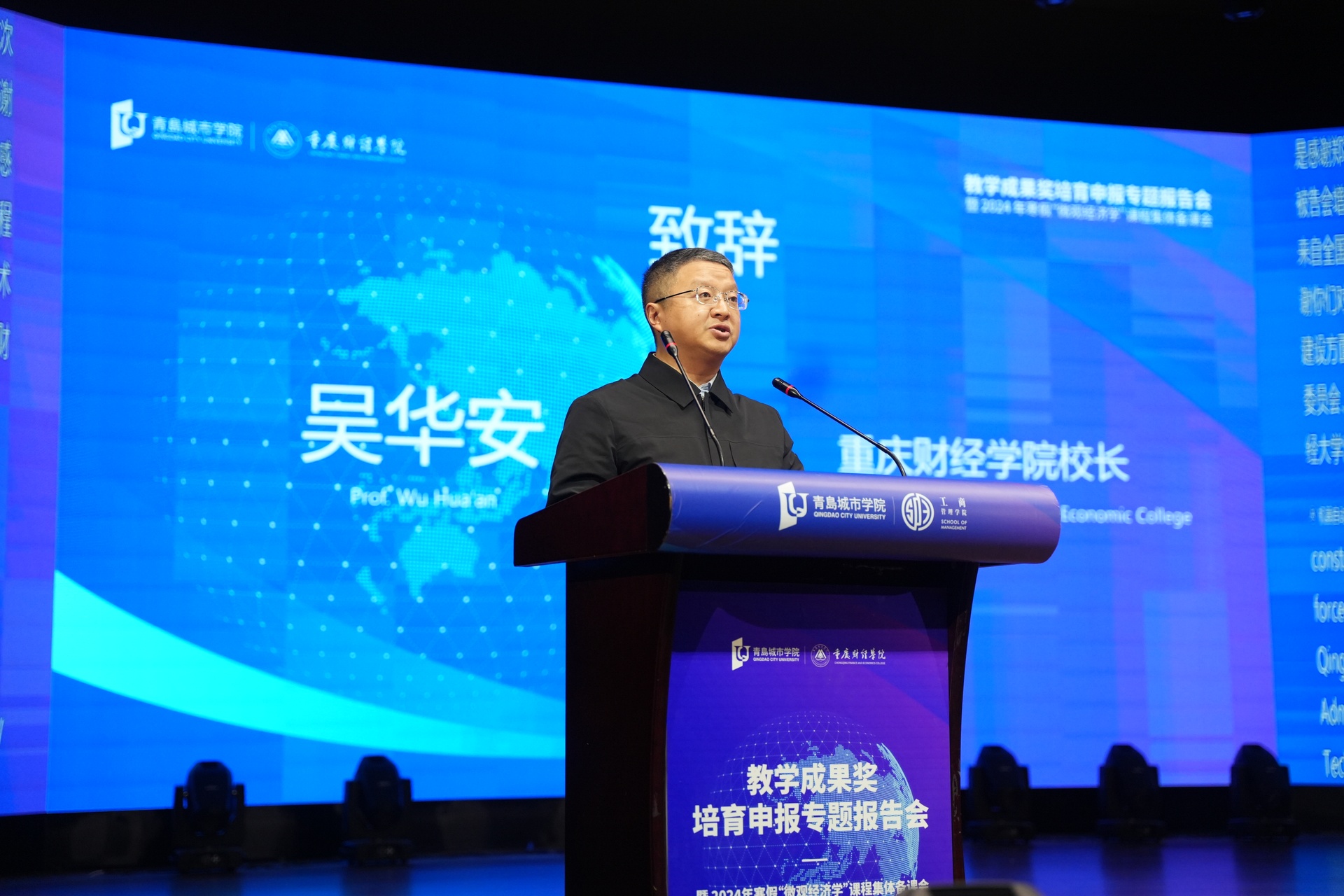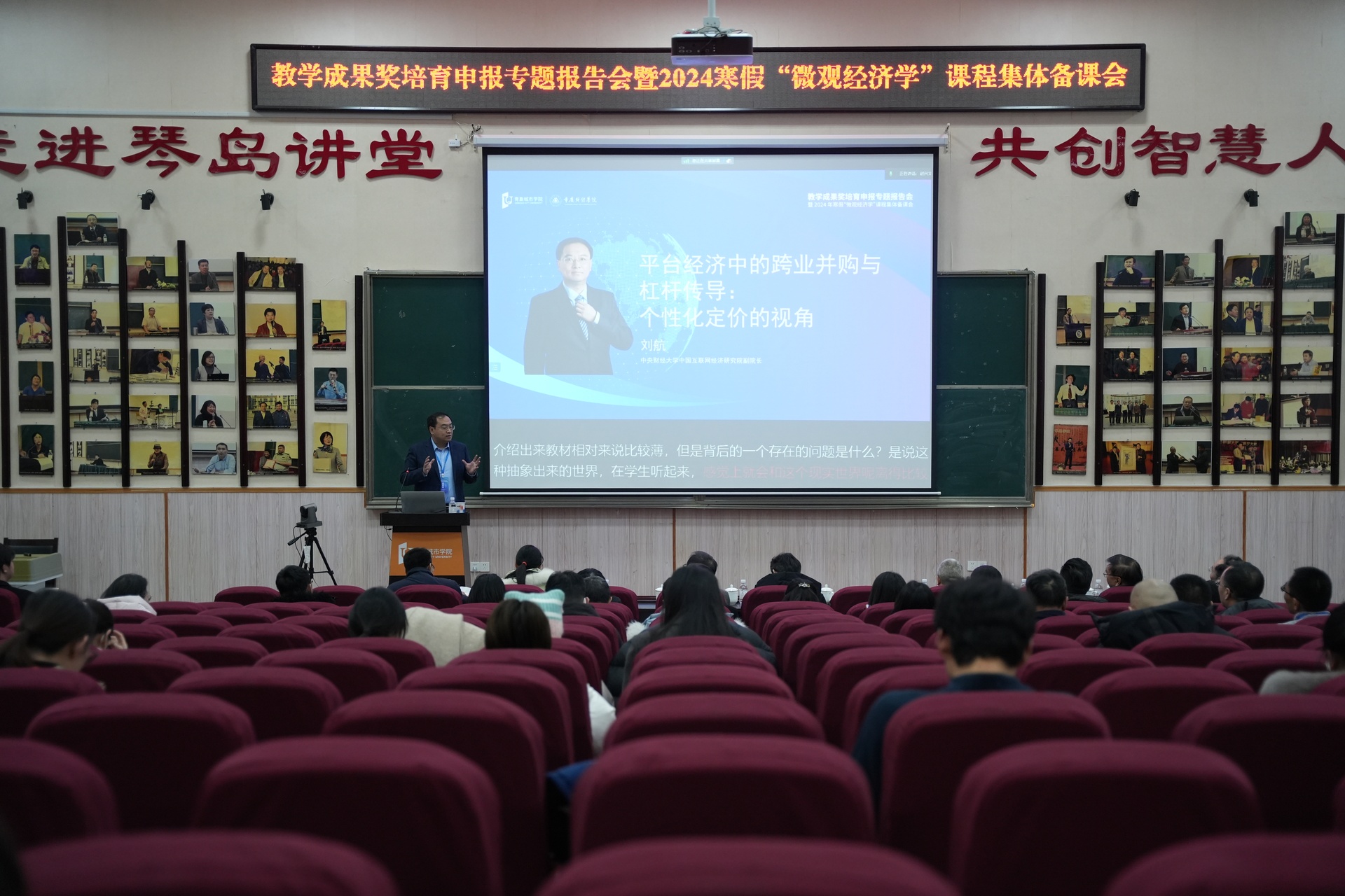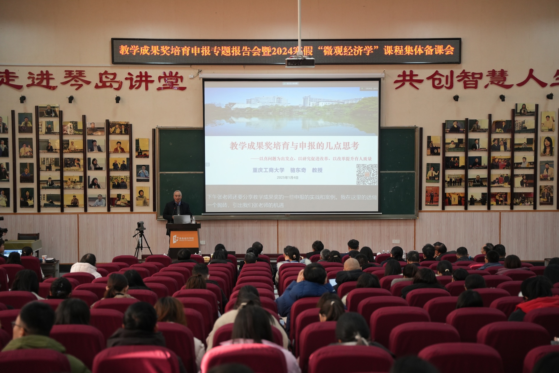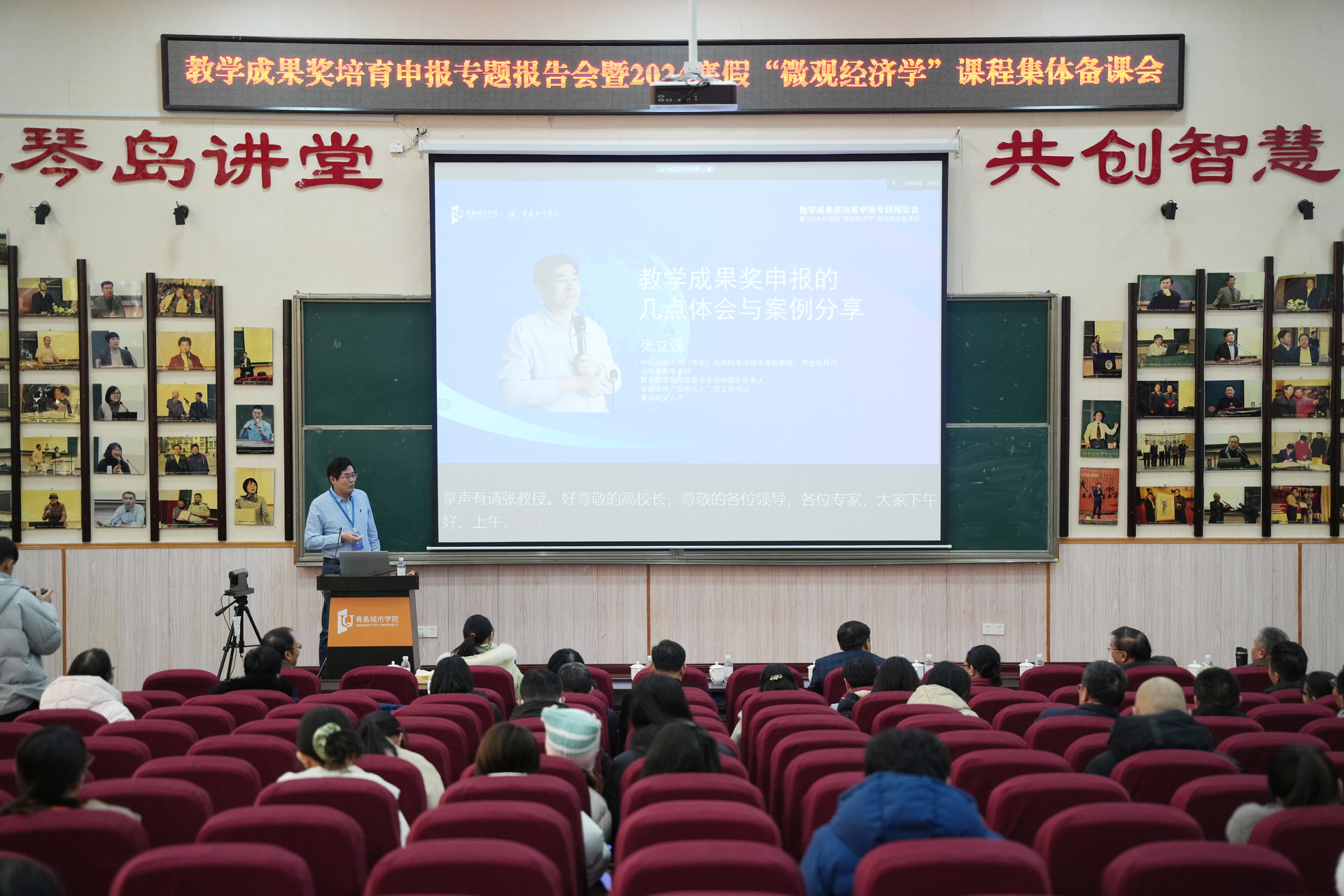 为了深入学习贯彻党的二十大和二十届三中全会精神,全面落实全国教育大会的决策部署和立德树人根本任务,全力推进学校高质量发展,1月4日上午,由我校市级经济学课程群虚拟教研室、青岛城市学院学术委员会主办,青岛城市学院工商管理学、青岛城市学院教务处、我校经济学院承办,成都杰科力科技有限公司和西南财经大学出版社联合协办的“教学成果奖培育申报专题报告会暨2024年寒假‘微观经济学’课程集体备课会开班式,在青岛城市学院礼堂隆重举行。来自全国20多所高校,近30位领导专家、学者、青岛城市学院各教学院部领导和教师代表200余人参与现场,同时全国50多所高校,70余位专家和教师通过线上方式参加本次活动。
