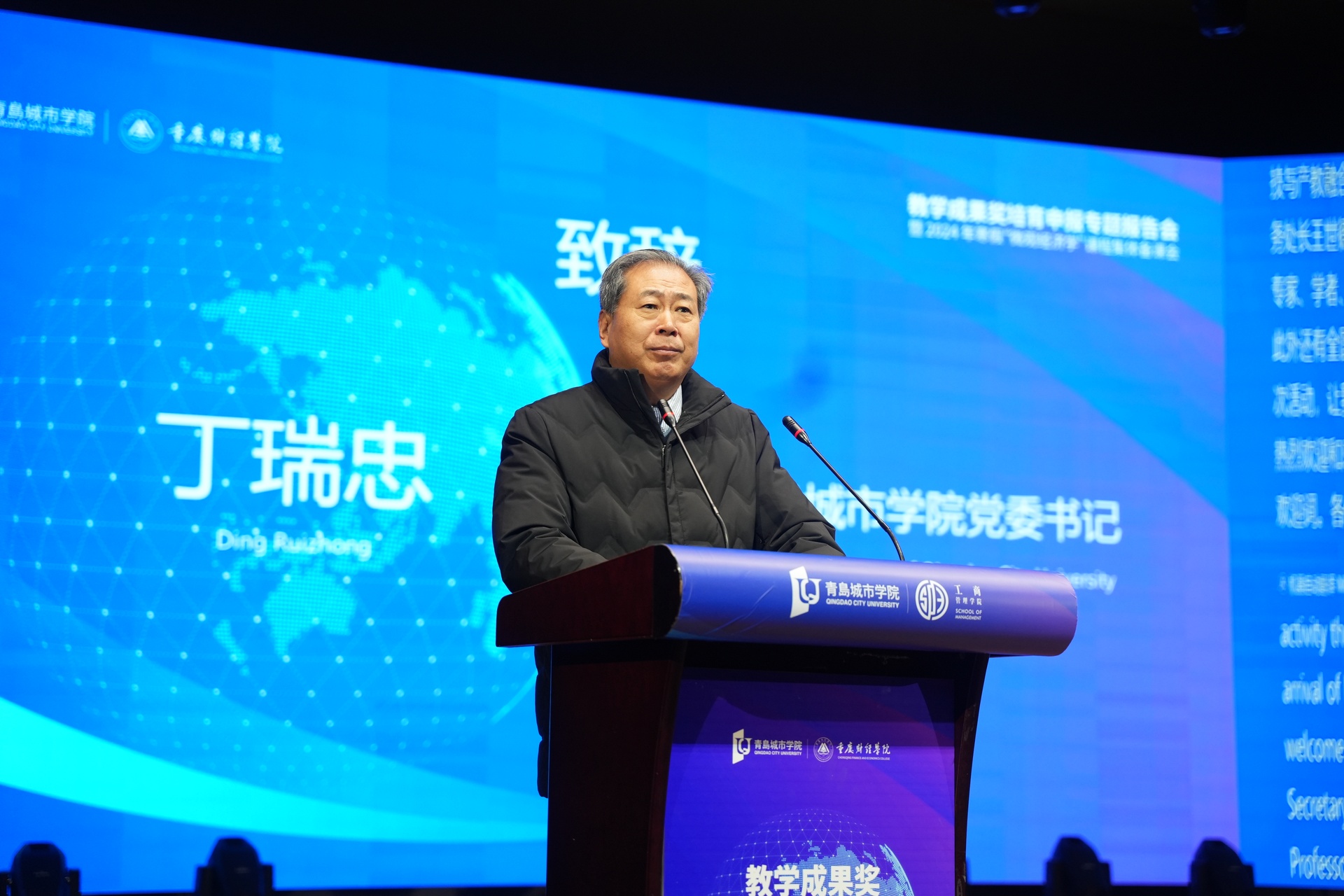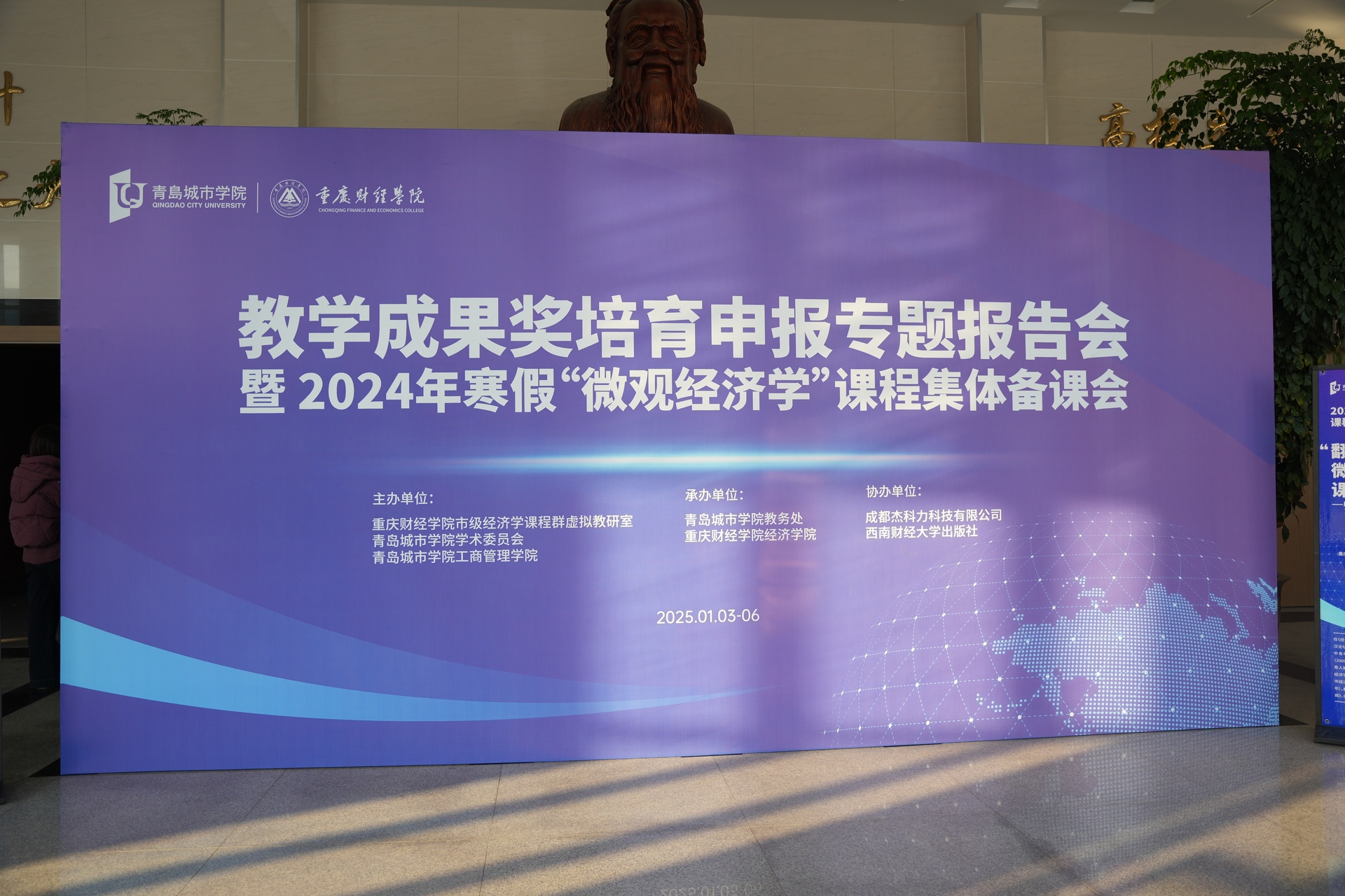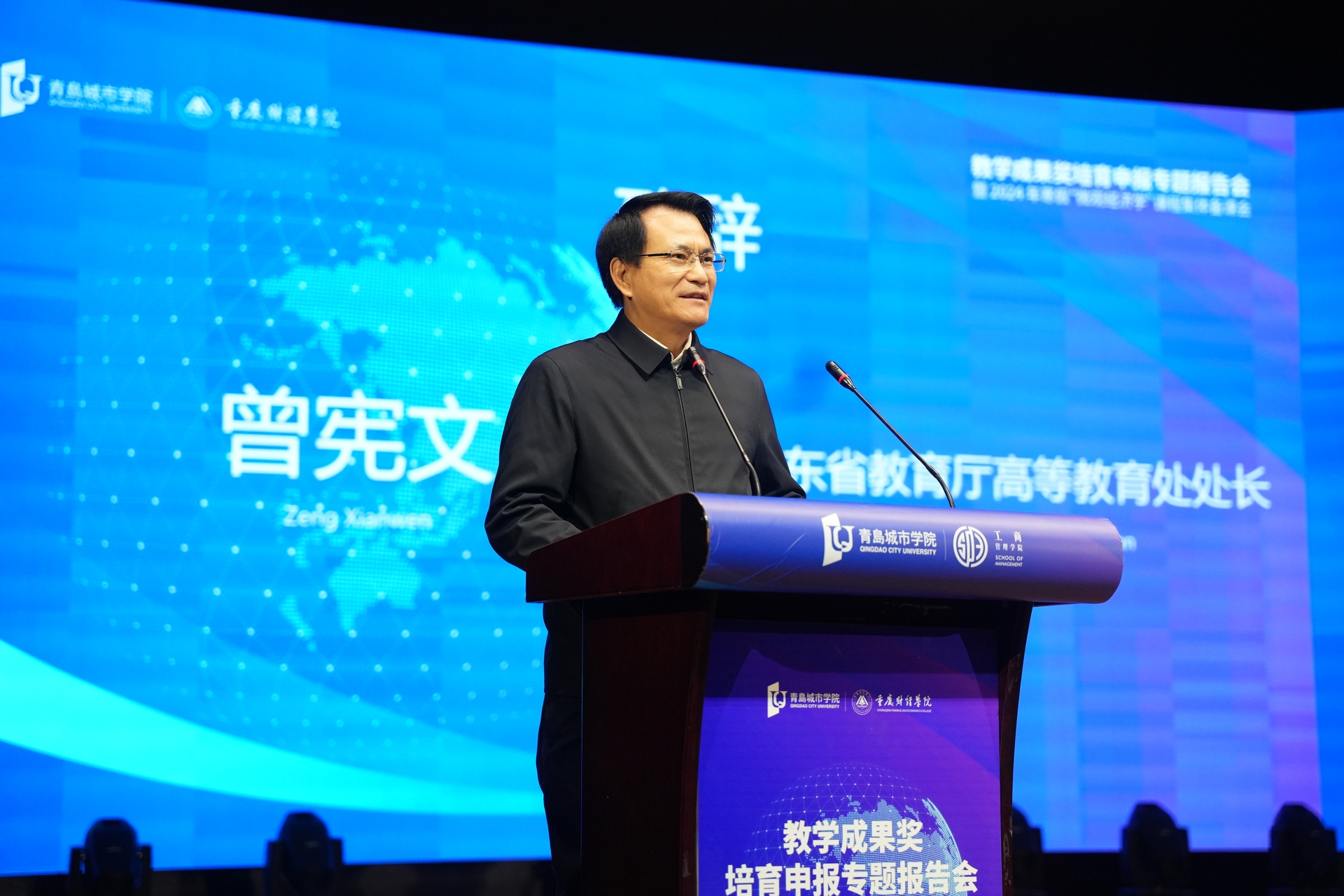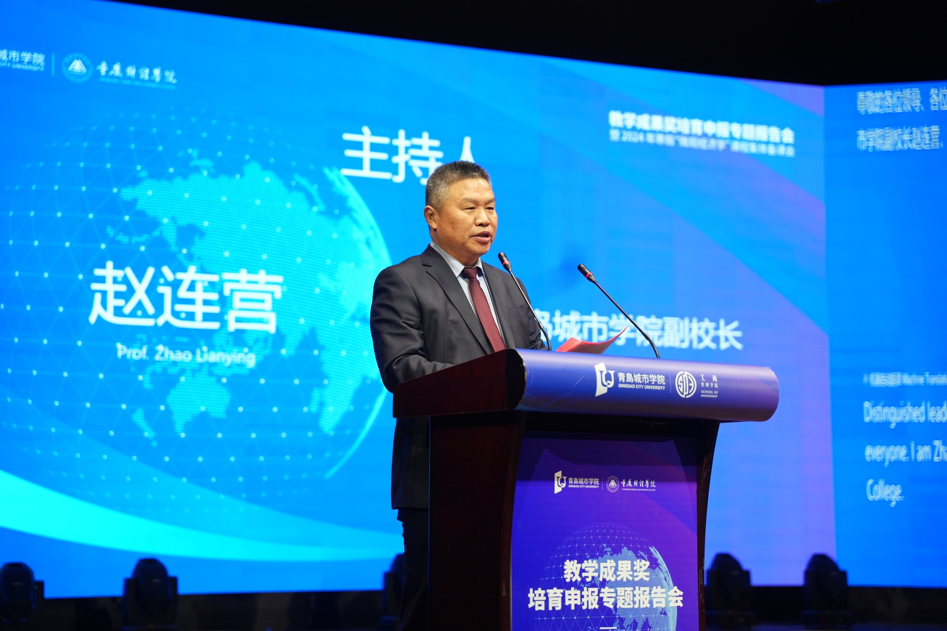 为了深入学习贯彻党的二十大和二十届三中全会精神,全面落实全国教育大会的决策部署和立德树人根本任务,全力推进学校高质量发展,1月4日上午,由我校市级经济学课程群虚拟教研室、青岛城市学院学术委员会主办,青岛城市学院工商管理学、青岛城市学院教务处、我校经济学院承办,成都杰科力科技有限公司和西南财经大学出版社联合协办的“教学成果奖培育申报专题报告会暨2024年寒假‘微观经济学’课程集体备课会开班式,在青岛城市学院礼堂隆重举行。来自全国20多所高校,近30位领导专家、学者、青岛城市学院各教学院部领导和教师代表200余人参与现场,同时全国50多所高校,70余位专家和教师通过线上方式参加本次活动。